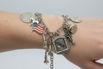 This is a great examples on 1970s culture- girls and young women received a link bracelet just like this, and received charms to mark birthdays, special occasions, travel, and charms with meaning only known by the wearer. This makes each charm bracelet different and unique. The charm would be taken to a jeweler to attach to the bracelet.This chain bracelet is composed to the typical double round links (providing security for the charms), and measures 7" long. It has a spring claps and is marked Sterling.
