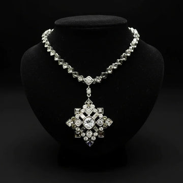 This is a stunning necklace, made of a chain of clear and gray diamond shaped rhinestones, and from it is suspended a breathtaking element. Radiating out from the center are baguette, oval, diamond shaped and baguette stones in gray and clear. It has a hook closure and measures 14.5", and can be worn shorter. The center drop measures 1.5" by 1.5" . This is a dramatic and regal accessory! Free Shipping