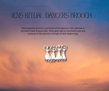 This brooch represents 4 hourglass figures (triangles joined together), which represents the fertile female form, and by showing them with their hands raised above their heads, we can tell that they are ritual dancers. Such dancers were common in Ancient Greece (around 1400 BCE) at funeral rites, and were intended to represent the triumph of life rather than the mourning of death. It is made of pewter with a silver finish, and measures 1 inch by 1.5” wide. On the reverse it is signed ICNS with each letter on a figure.