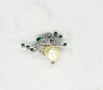 Dazzle and delight with this exquisite brooch, crafted from a bold teardrop baroque faux pearl, adorned with a regal array of sparkling prong set clear and green rhinestones. Its intricate design and impressive size of 1.75" make it a true work of art, encased in lustrous silver tone metal. Elevate your look with this statement piece that exudes sophistication and elegance.