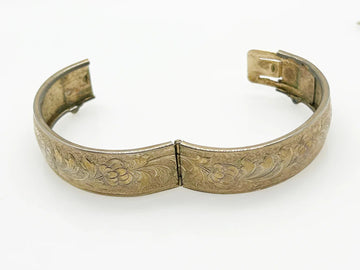 Add a new dimension to your style with this striking vintage bangle adorned with intricate etchings of swirling patterns and delicate designs. Standing at a height of .5", it effortlessly adds a unique touch to any ensemble. While it may be missing a safety chain, rest assured that the clasp is secure, allowing you to wear it with confidence. Don't miss out on this one-of-a-kind piece that will elevate your style to new heights!