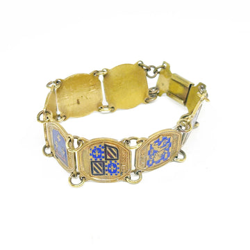 This is a vintage enamel and brass souvenir bracelet with heraldic crests from various regions of France. It is a striking link bracelet featuring the heraldic crests of French regions.The bracelet is 7 inches long and includes crests for regions like Bourgogne, Touraine, and Normandie.The crests feature traditional heraldic motifs such as fleur-de-lis and lions. These bracelets became popular as early as the 1930s through the 1960s, and were often referred to as "Grand Tour" jewelry.
