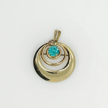 This is a striking piece, made of three polished gold rings of graduating widths, centered around a prong set glittering turquoise aqua stone. It measures 1.5" long, and can be worn either as a pendant or a brooch.