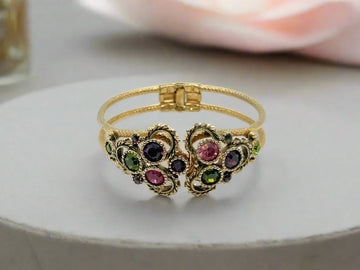 This is a pretty and versatile bracelet made of two rows of gold tone which meet in a design set with olive green, pink and purple large and smaller stones. They are set in a detailed prong setting, and the two ends open to allow for wearing. It is signed "Coventry" in block letters and is in excellent condition. It will open to accommodate most wrists. It measures about 6.75" inches and is in excellent condition.