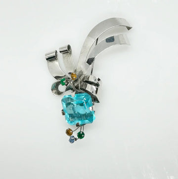Presenting an exquisite vintage bow brooch, a captivating piece that showcases a stunning square aqua stone, elegantly set in lustrous sterling silver. The brooch is further embellished with delicate green and gold rhinestone tremblers, adding a touch of vintage glamour. The underside bears a clear sterling stamp, attesting to its quality and authenticity. This remarkable brooch measures approximately 3.5 x 2.25 inches and, while showing some minor surface wear consistent with its age, remains in overall excellent condition. Please note that the beautiful blue center stone may exhibit a slight shift in its setting. Free Shipping