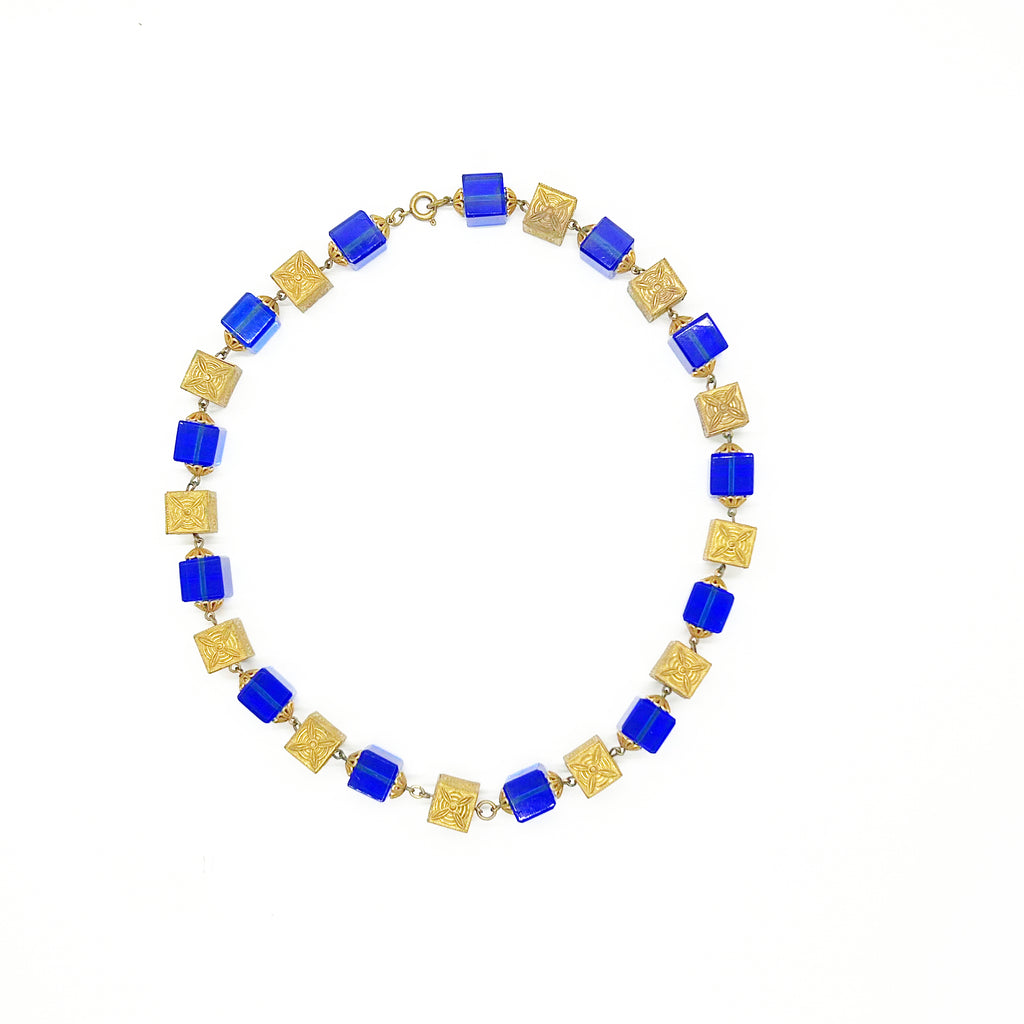 This is a beautiful antique necklace-choker made of square, embossed brass beads with deep cobalt blue square beads. The blue beads have to be seen in the light to be truly appreciated. The necklace measures approximately 17 inches long.