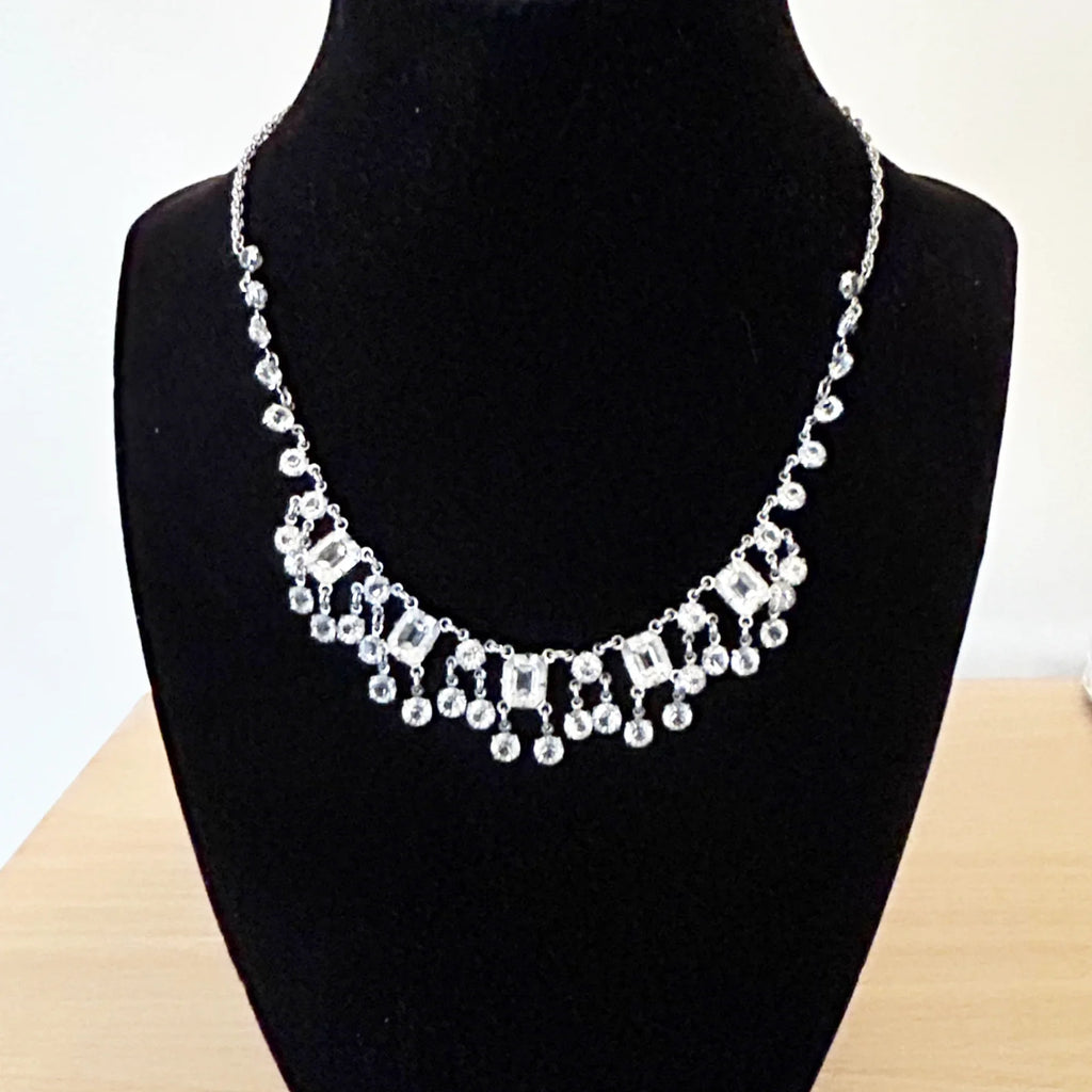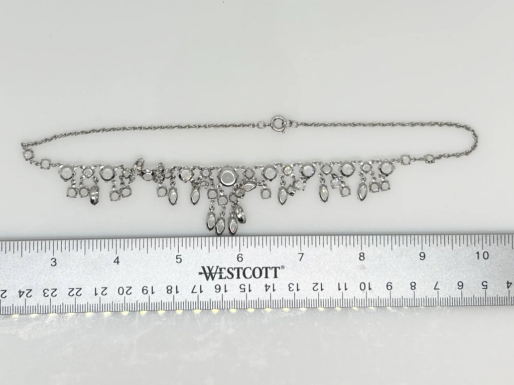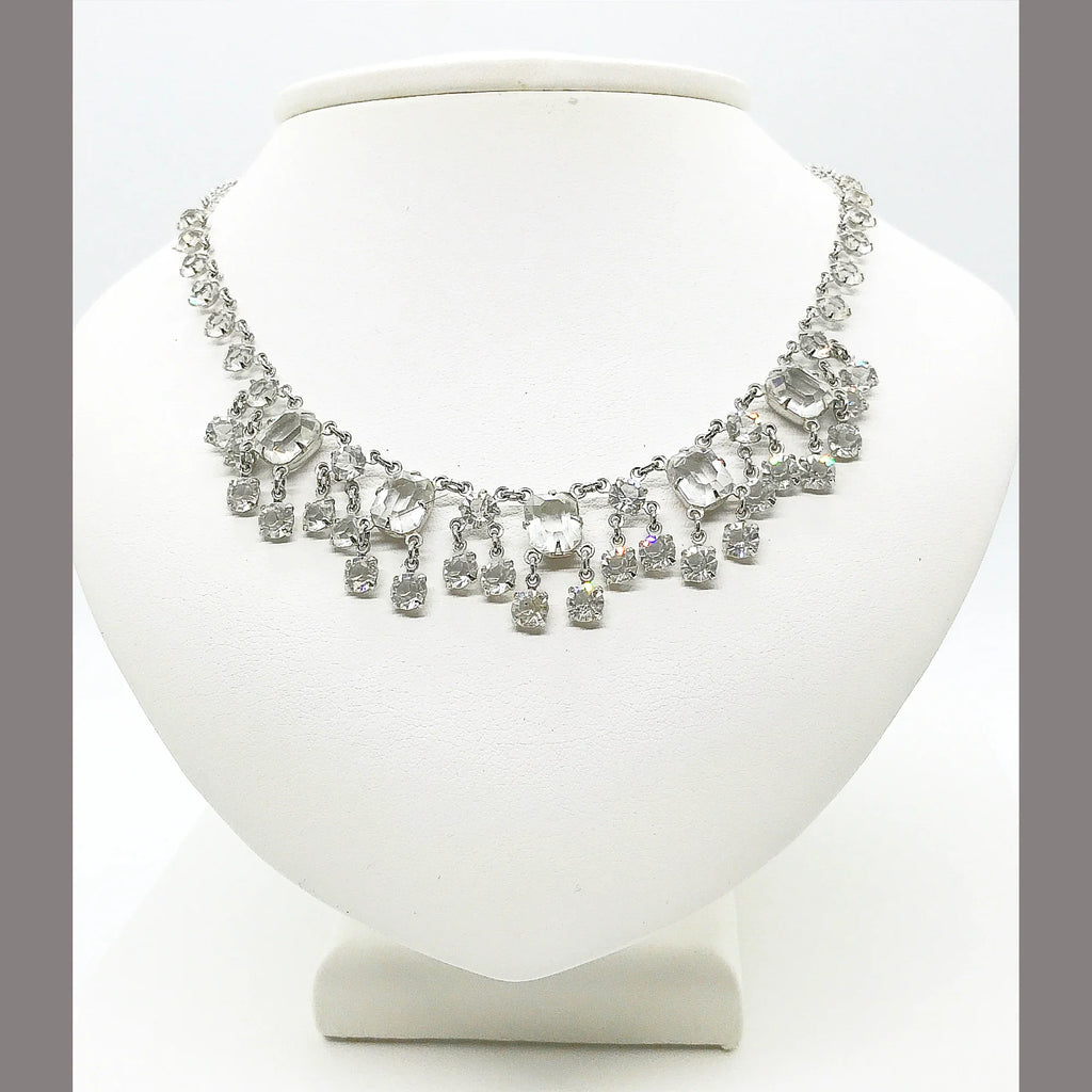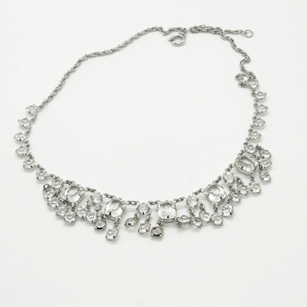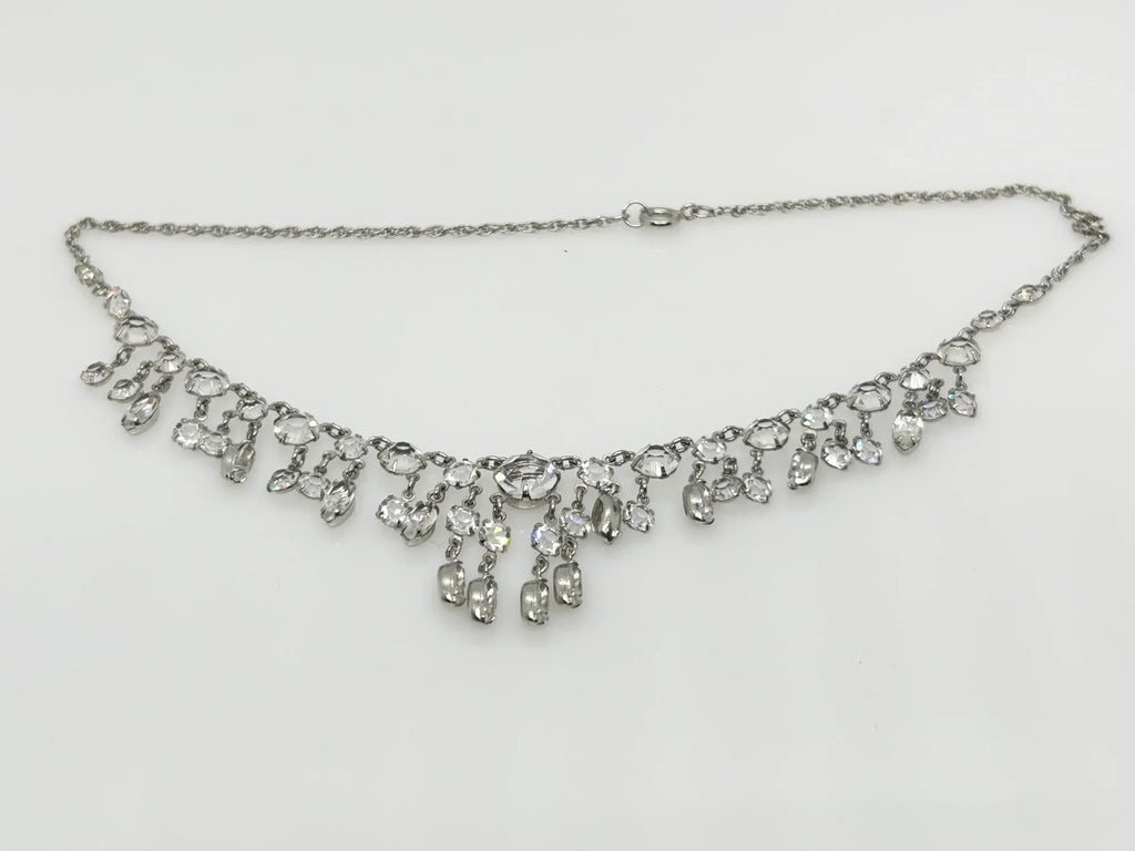 This vintage crystal necklace radiates refined elegance, drawing admiration with its subtle sparkle. Featuring expertly cut round and emerald cut crystals set in an open back rhodium design, it showcases delicate brilliance. Measuring 15.5" long, it secures with a classic spring clasp and is in excellent condition. Free Shipping