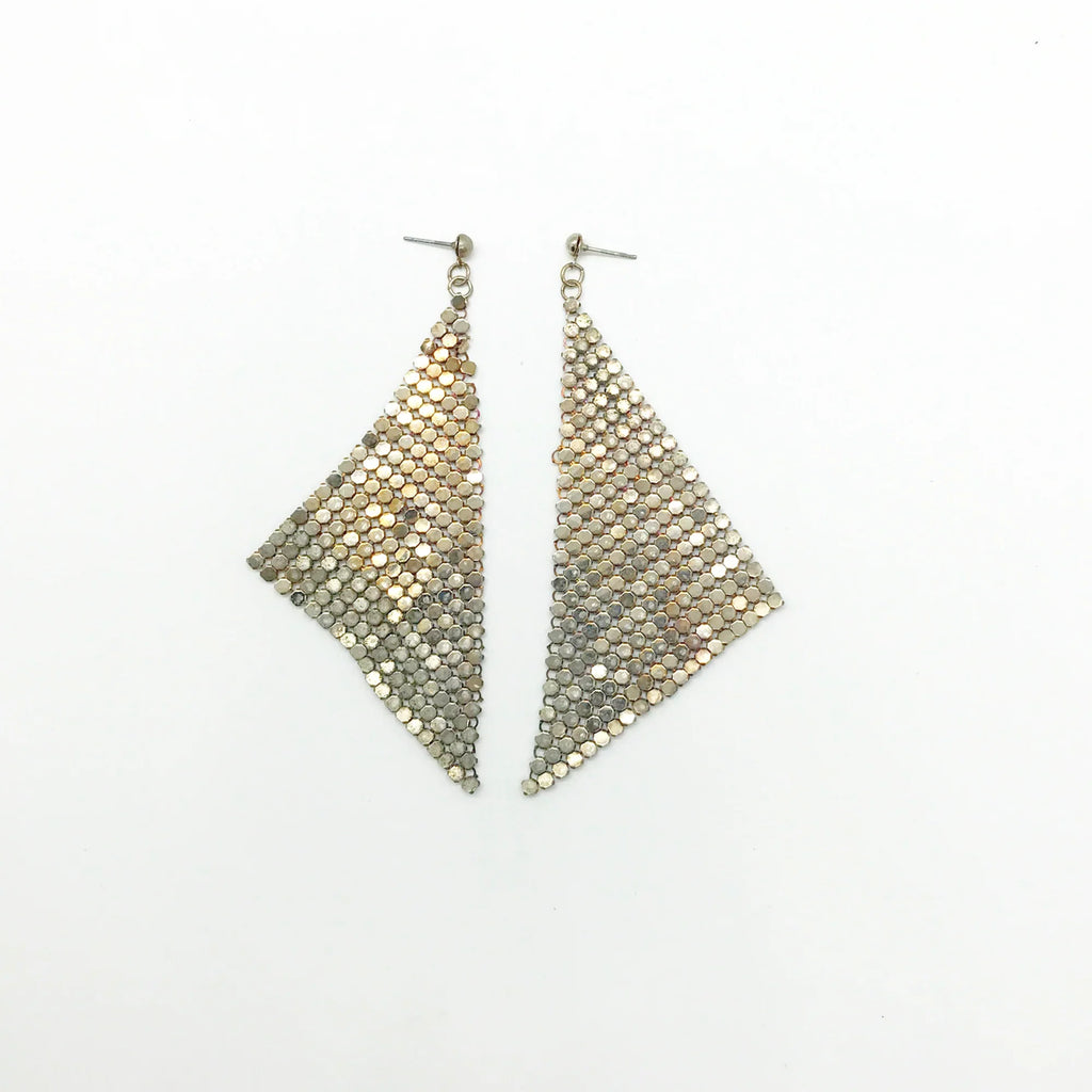 These are elegant and eye catching- and even more special once you give them a second and third look. Each tiny round disc is attached to the others by even more tiny rings. They are set in a triangular mesh that drapes and reflects the light. They each measure 3 1/2" at the longest point and are on posts. Very light and easy to wear. They have a gold-coppery sheen. The workmanship is amazing.