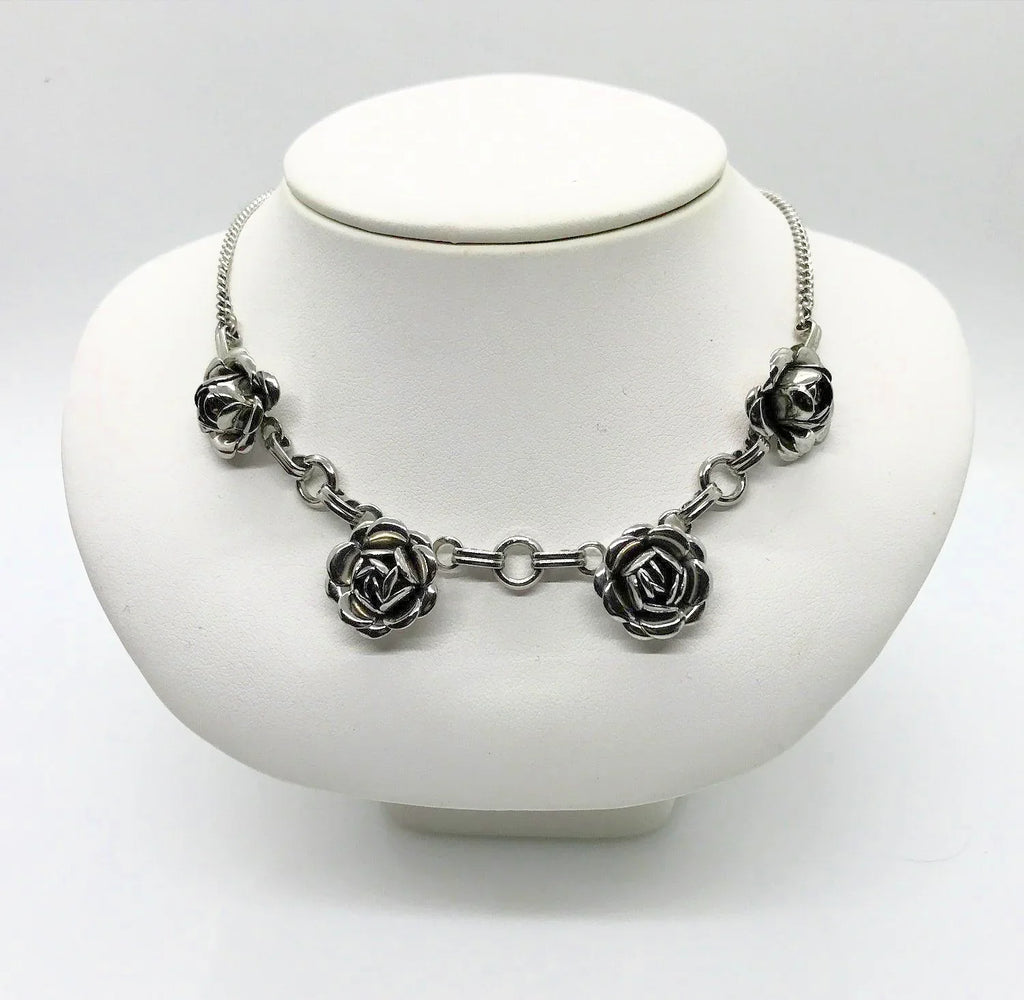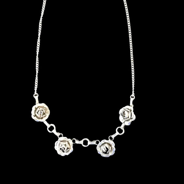 The delicate silver tone necklace boasts four stunning roses, each intricately designed and skillfully crafted. Measuring 16 inches in length, it's perfect for adding a touch of vintage elegance to any outfit and especially for a special occasion. Rest assured, this necklace is in excellent condition and ready to be worn with pride.