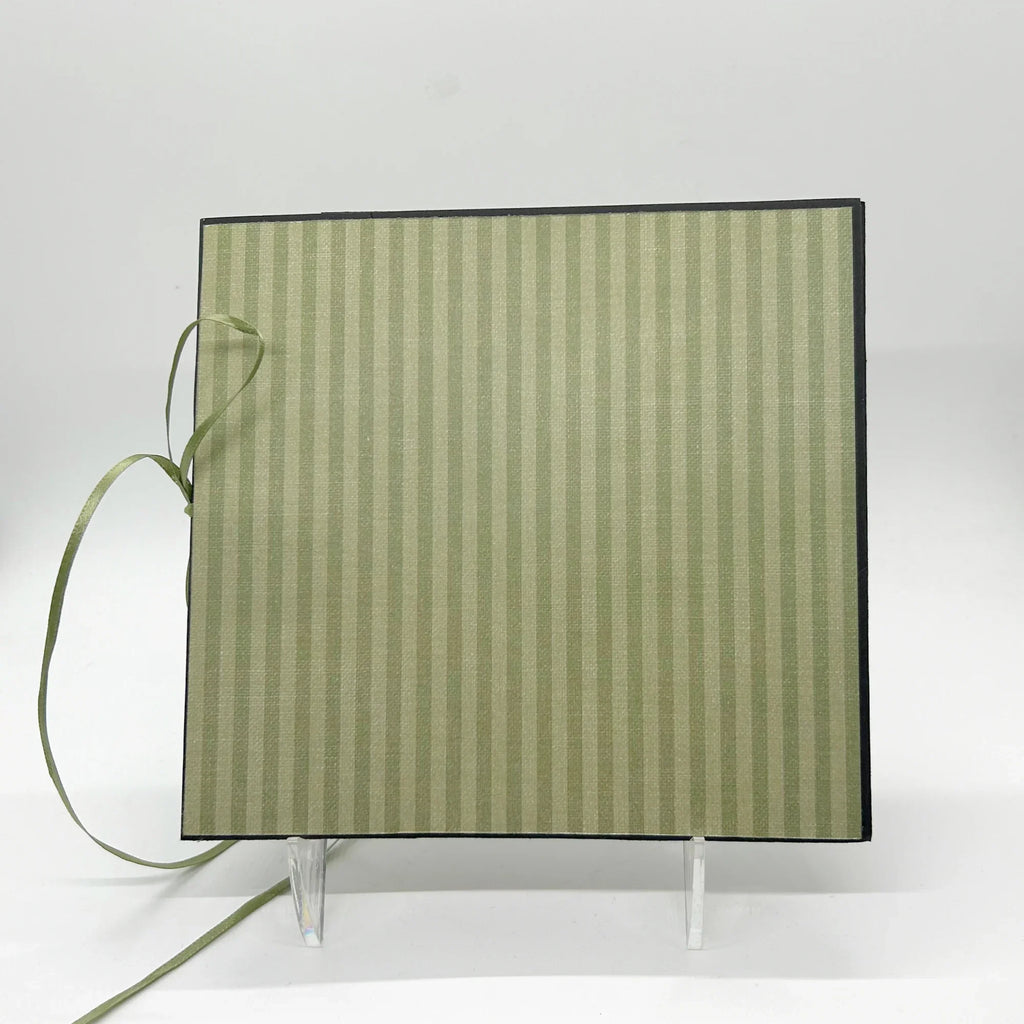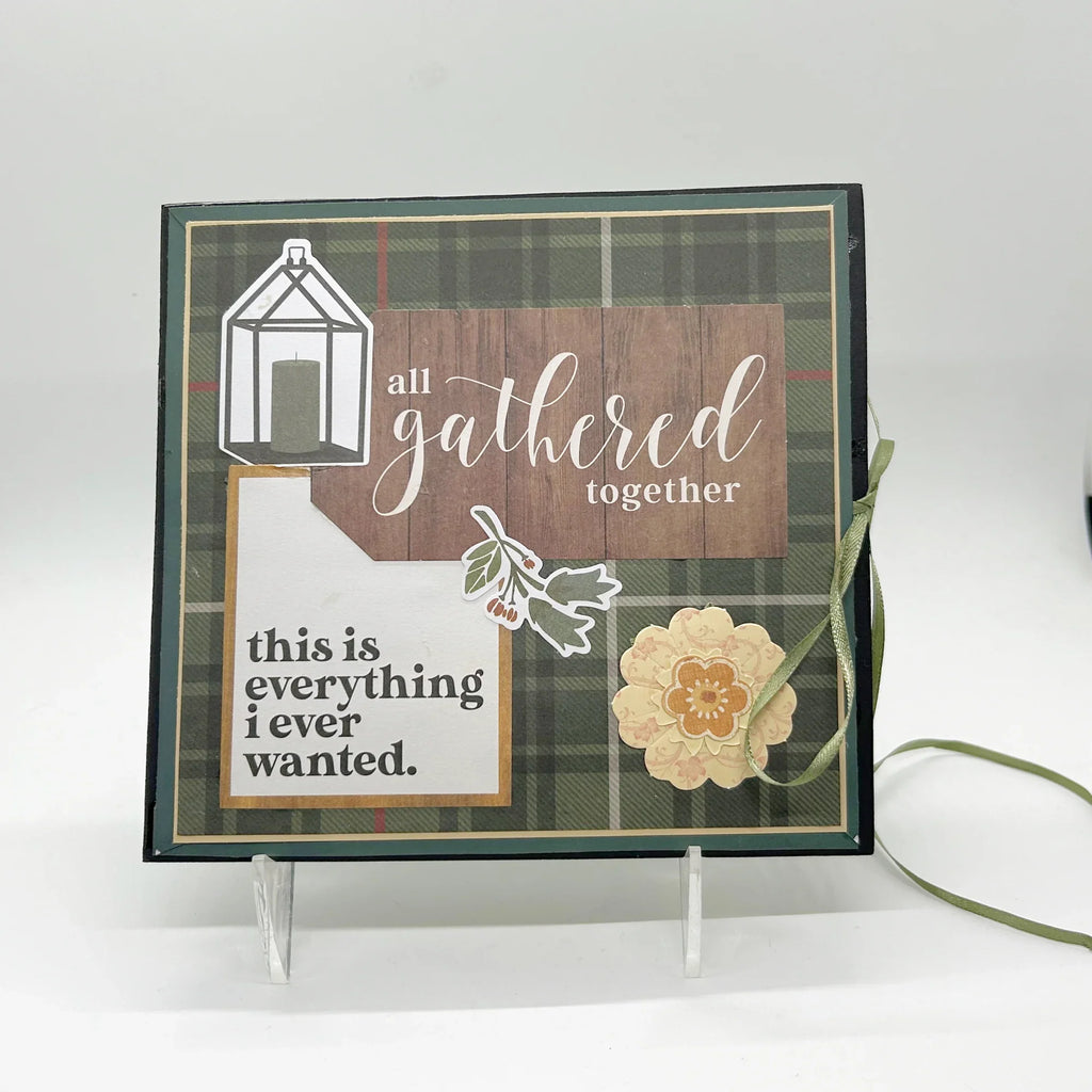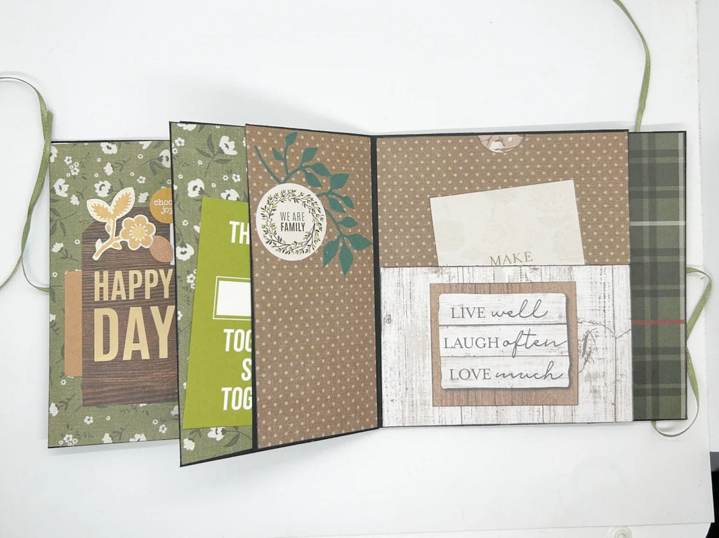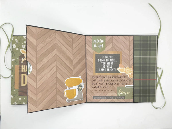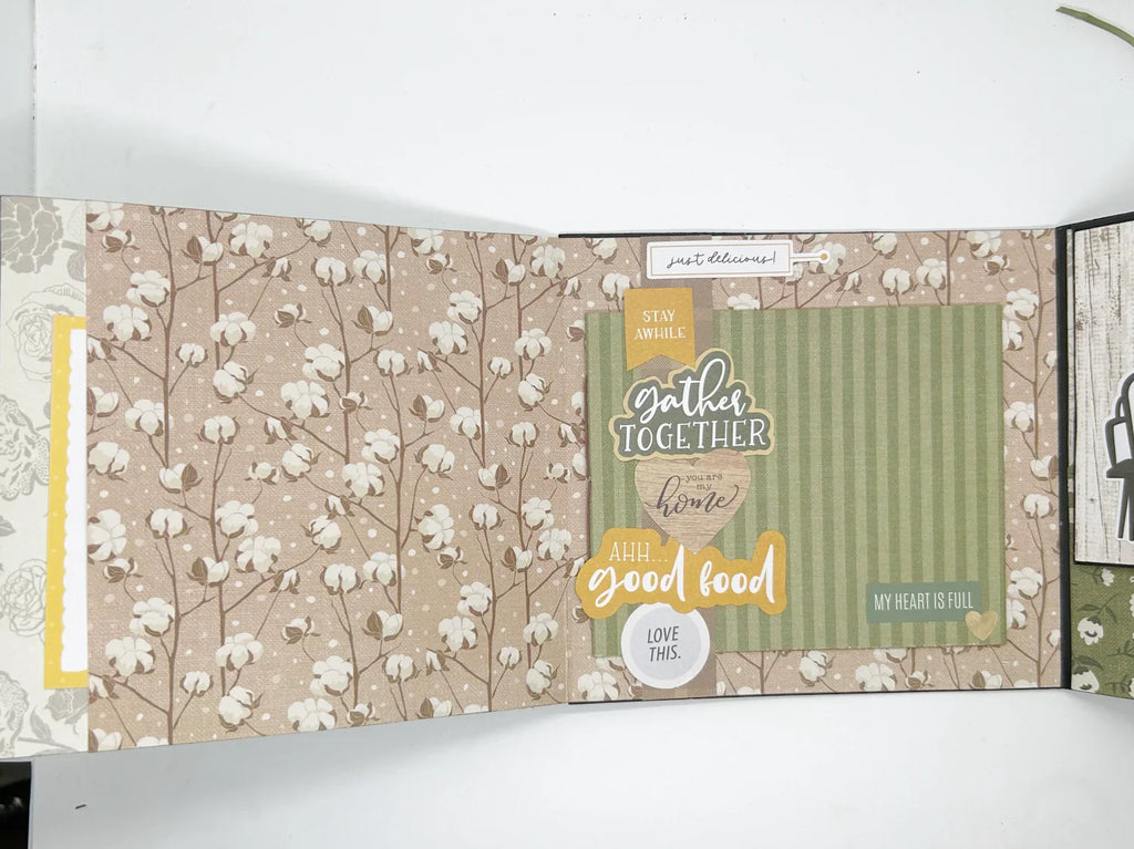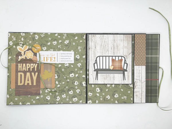This Handmade Mini Album is rich with character, including charming elements such as a porch bench, kitchen mixer, and wood-grain details, all emphasizing the essence of family life. The back cover’s delicate green ribbon secures the album and completes its stunning look, adding a gentle touch of elegance.