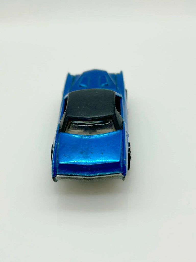 Sweet Sixteen, Spectraflame blue, with brown interior; the steering wheel matches the rest. It has clear glass and RL wheels. The hood opens nicely. This Hot Wheels car was based on the 1967 Cadillac Eldorado and designed by Harry Bradley. "US and For Pats Pend" on base. Very good condition. Free Shipping