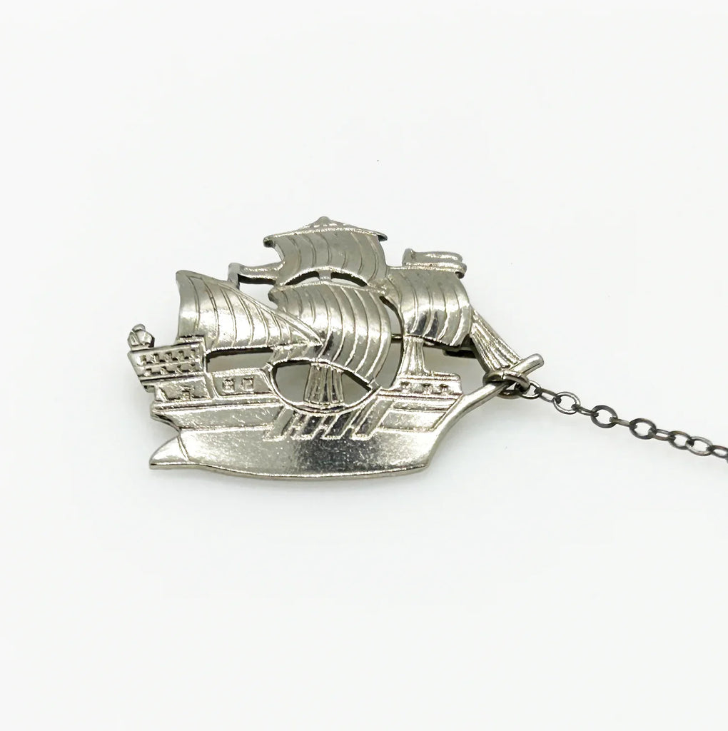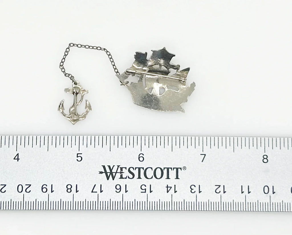Vintage Early 20th Century Silver Tone Galleon Sailing Ship and Anchor Brooch Pin