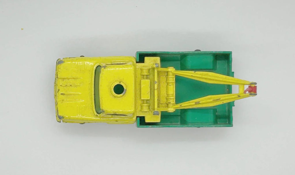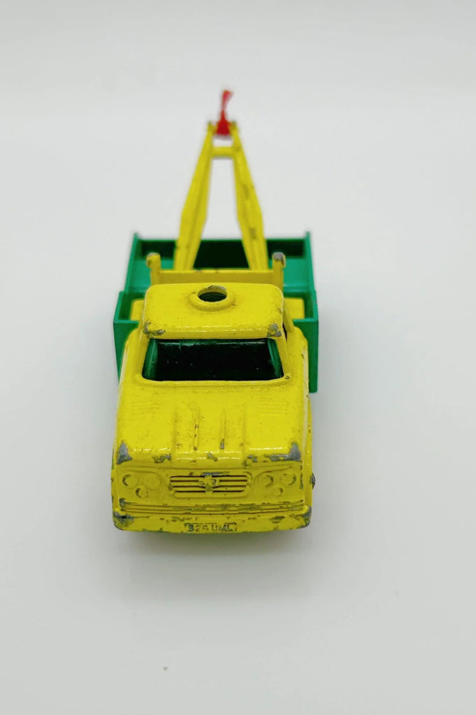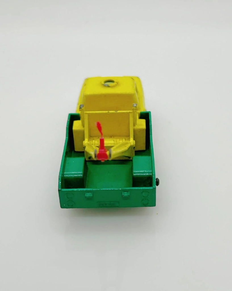 It has a yellow cab, green body and red hook, green base. The windows are green. Made in England by Lesney. No 13. 1:85 scale. It has had a tough time, missing the red light on the roof and the end of the hook. Great start for a project!
