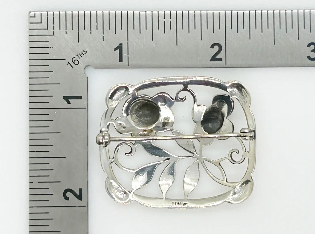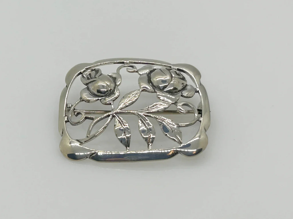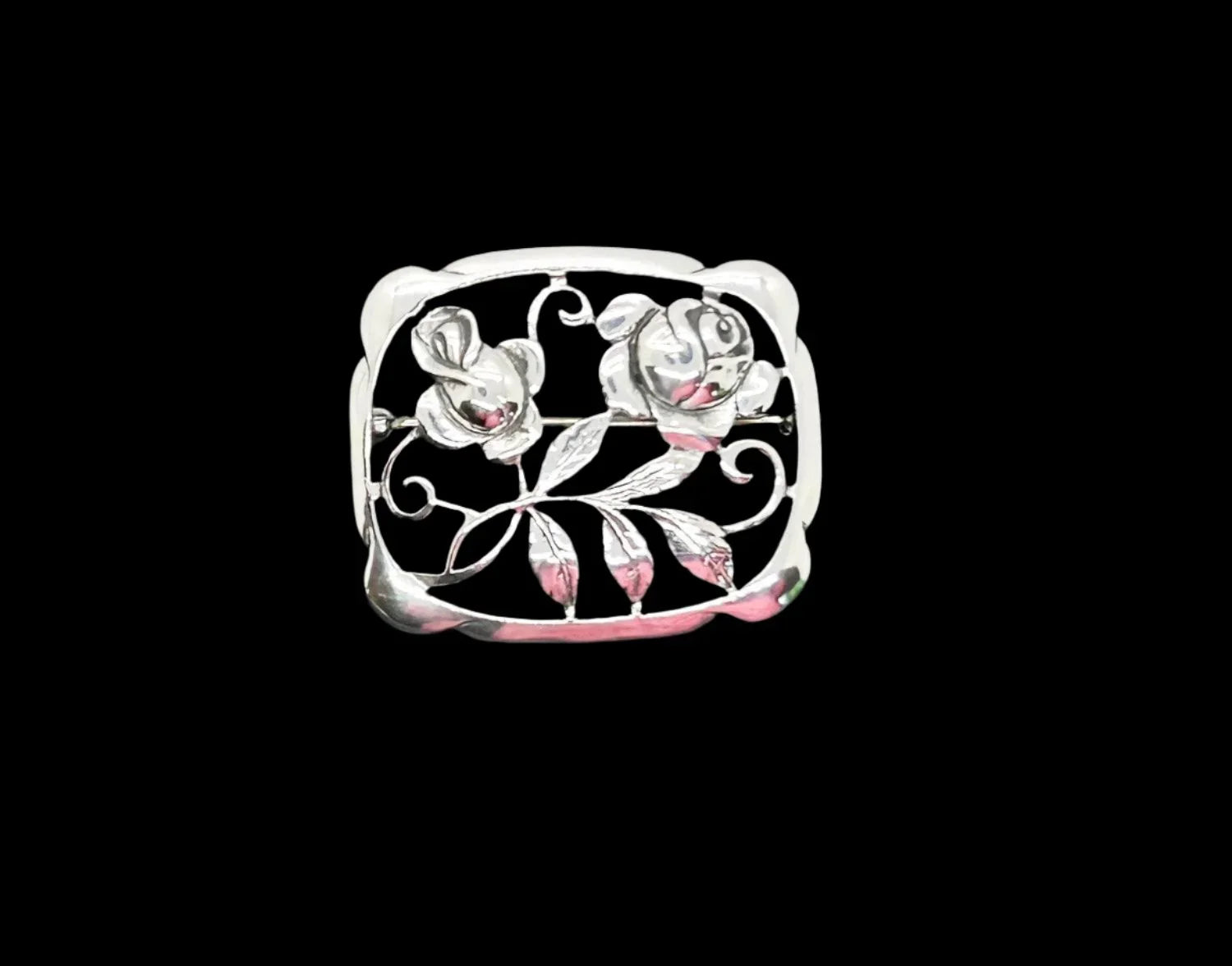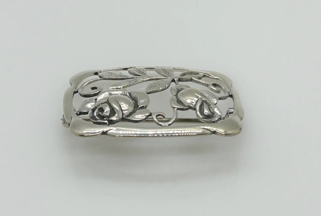 Embody vintage femininity with this stunning brooch crafted from high-quality sterling silver. The intricate floral designs of open roses, a rose bud, and leaves within a rectangular frame exude elegance and charm. At a wearable size of 1.5 inches, this brooch is perfect for making a statement, and its excellent condition makes it a timeless piece to add to your collection. Elevate your look with a touch of vintage beauty and sophistication.