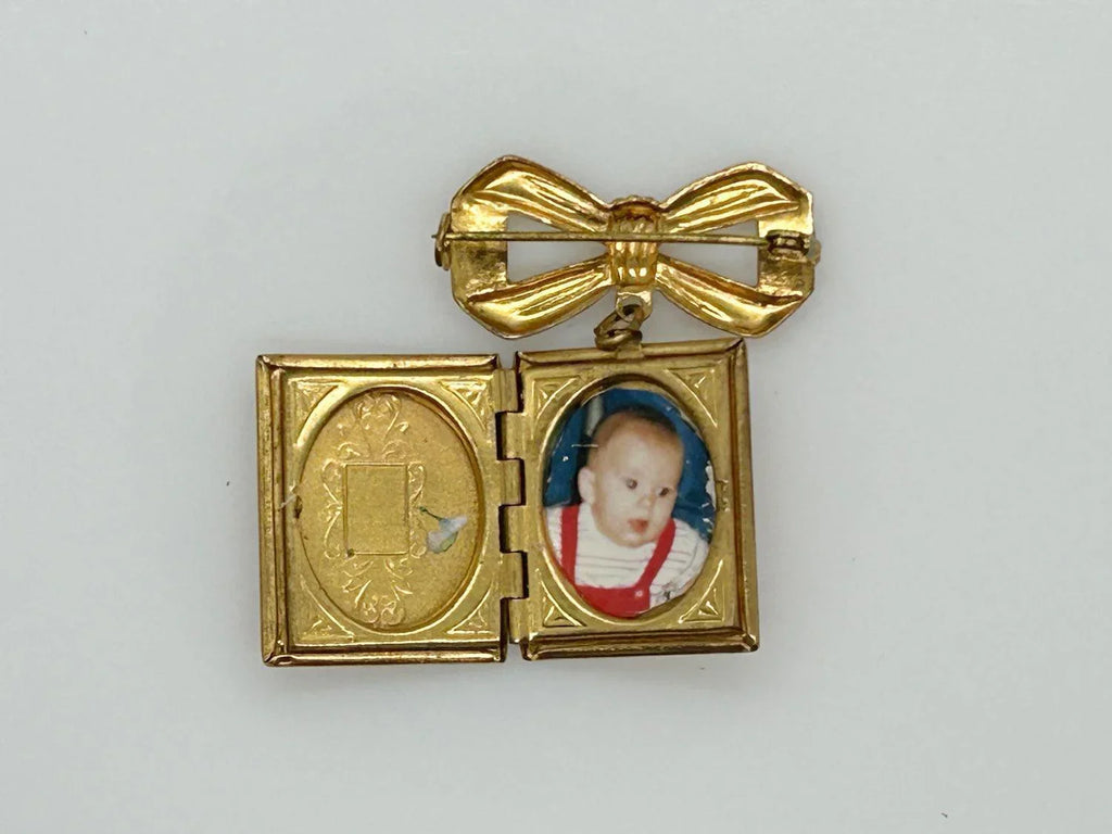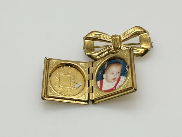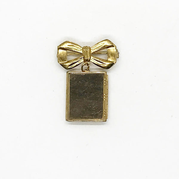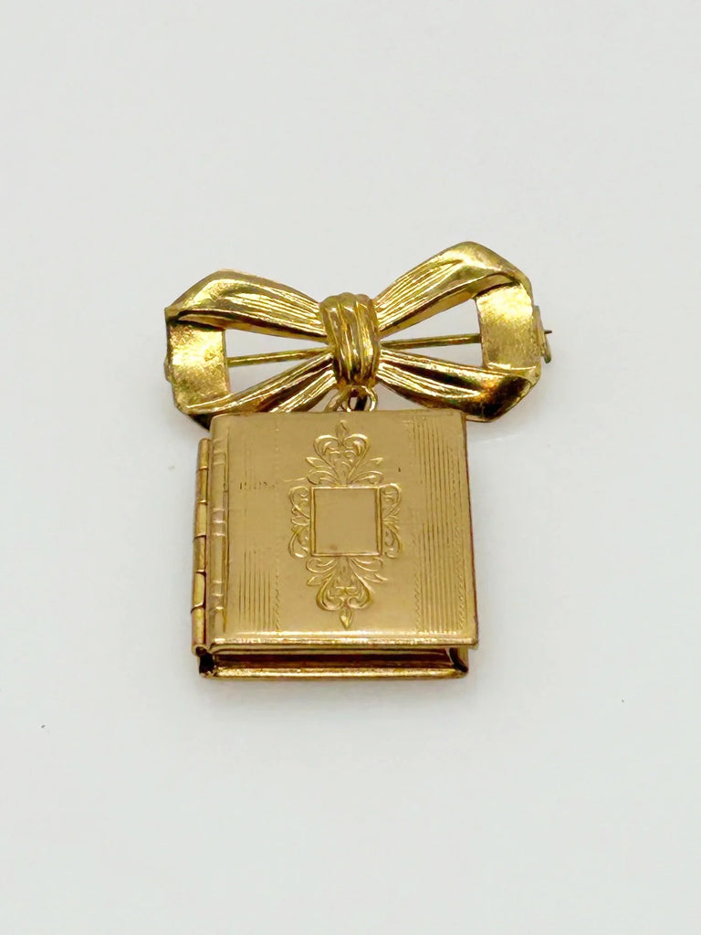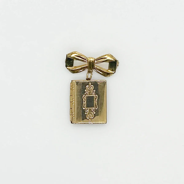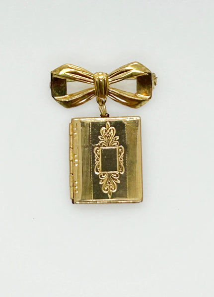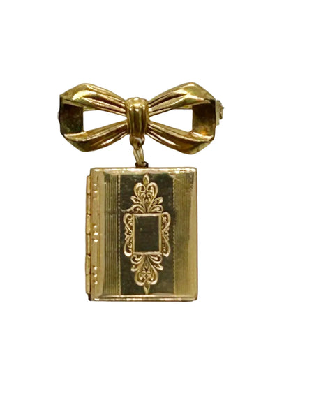 Add a touch of whimsy and old school charm to your wardrobe with this book-style locket. from the 1940's-1950's. The book is suspended from a bow and the brooch has a total length of bow and locket at 1.5" The locket itself is approximately 1" tall and 3/4" wide. It has an art deco themed cover with ridged and scrolled design. There is a color photo inside that can be removed. This has a C-clasp to the pin. It is not marked or signed and could be under the photos. Very good condition.