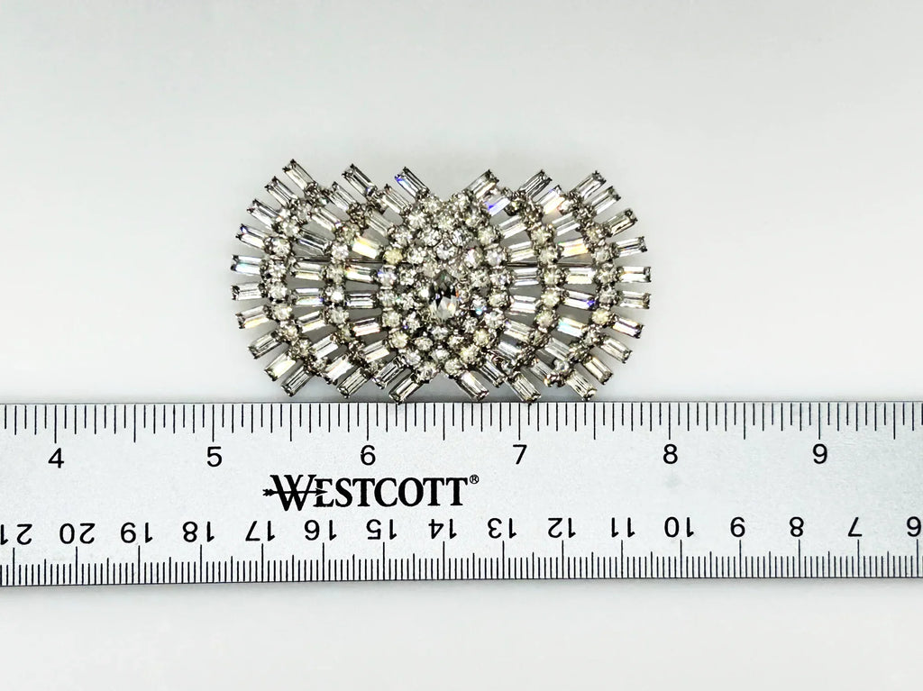 Bold and dazzling, our Geometric Deco Style Layered Vintage Brooch is adorned with bright, clear rhinestones. With a mix of baguettes, round, and pear shaped stones, it catches the light at every angle. Versatile to wear at 2.5 inches wide or tall, this stunner is a must-have for any fashion-forward collector. Elevate any outfit with this luxurious, statement piece. Free Shipping
