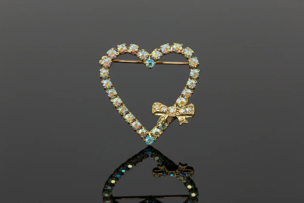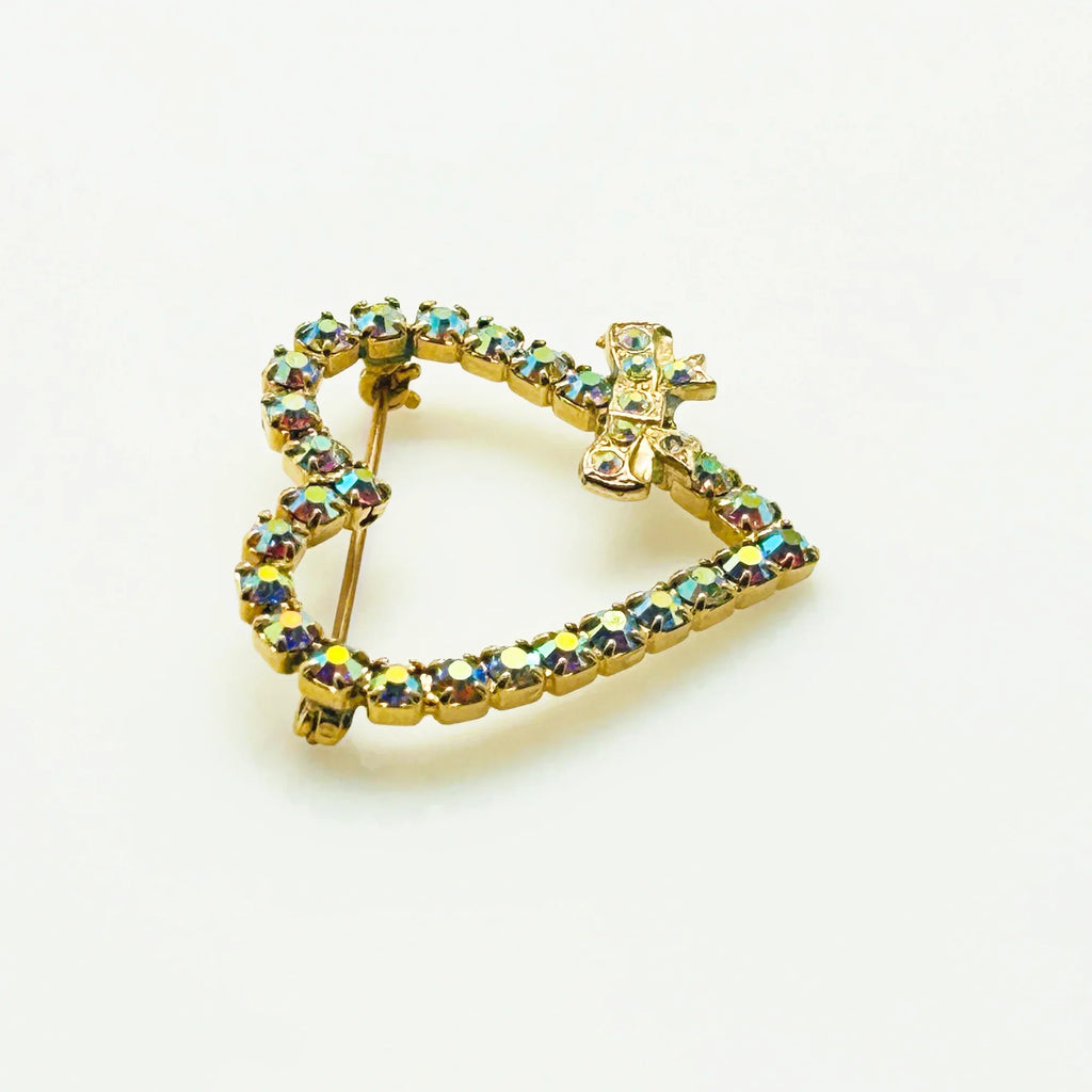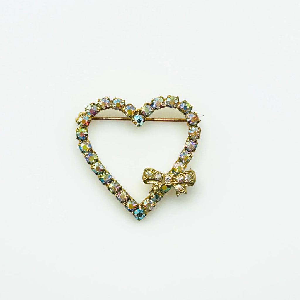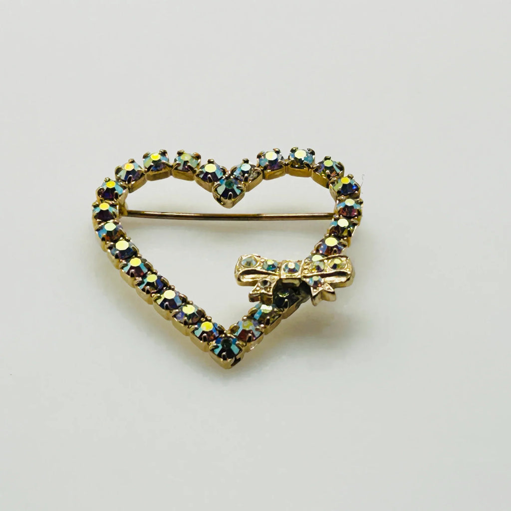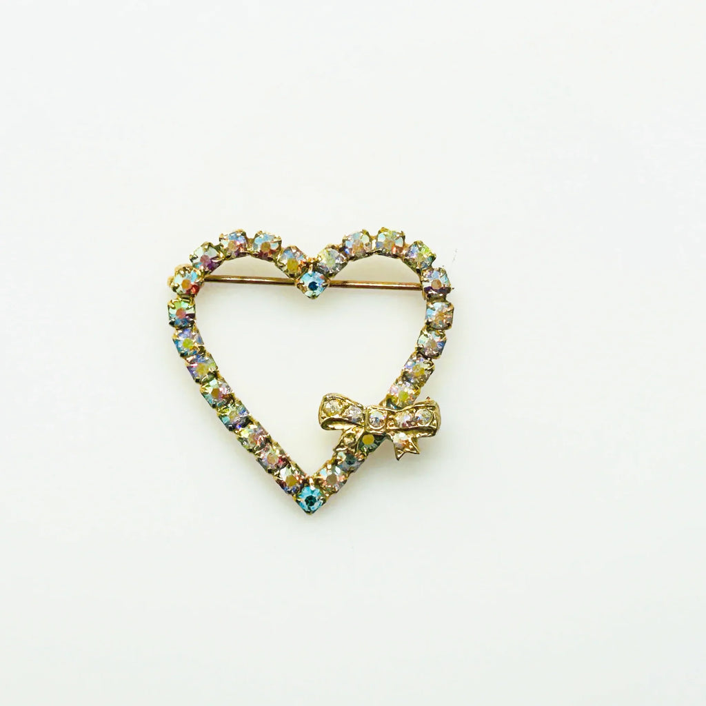 This charming mid-century brooch captures all the sparkle and romance of vintage glamour. The delicate gold-tone heart showcases shimmering aurora borealis rhinestones that dance with rainbow fire, while a sweet bow accent adds an extra touch of whimsy.