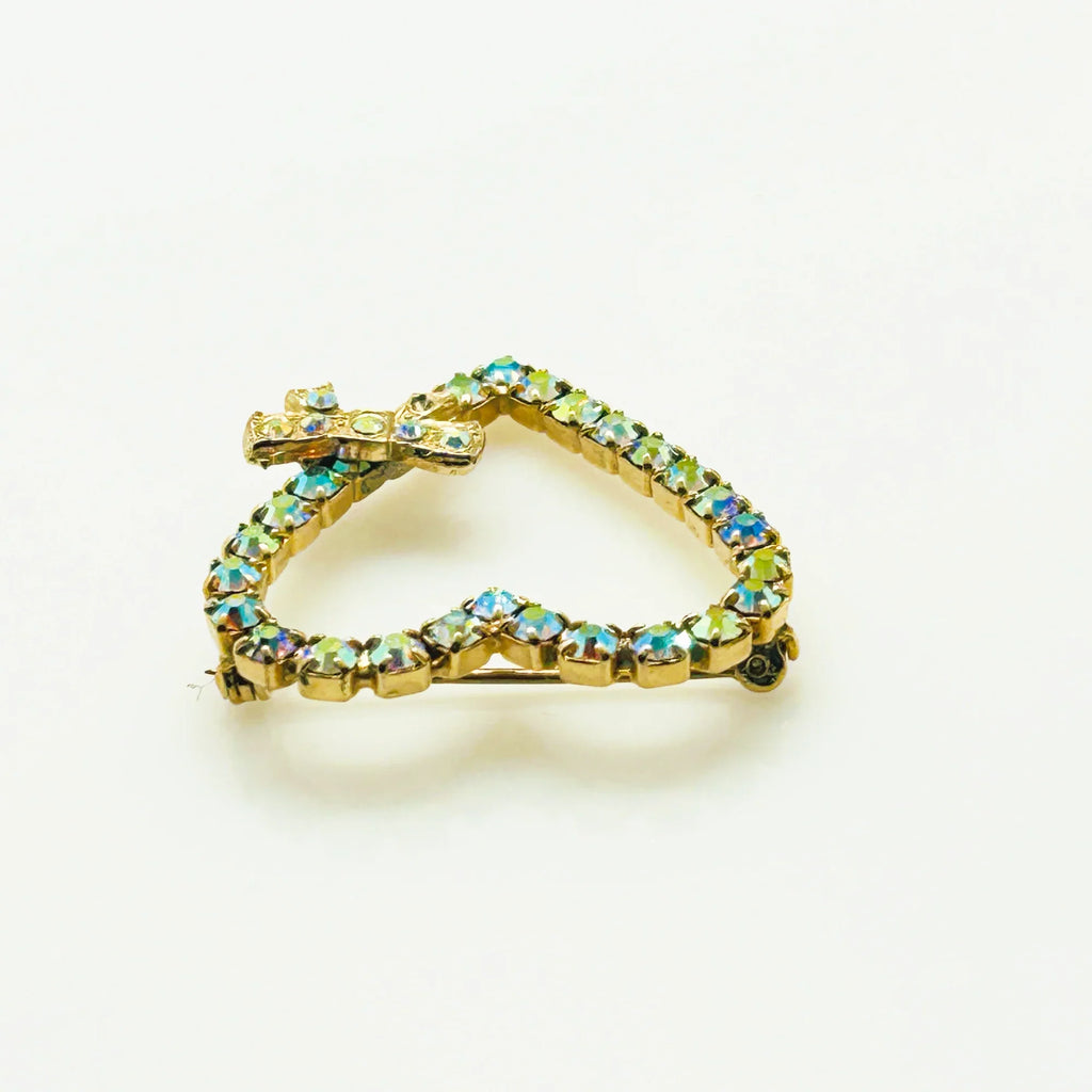 Made from high-quality gold-tone metal, this brooch is durable and designed to be worn for years. The aurora borealis rhinestones are carefully hand-set, ensuring each stone is secure and beautifully positioned. This mid-century piece captures the essence of vintage craftsmanship. Its delicate heart shape is perfectly complemented by the fine bow detail, which is subtle but unmistakably charming. The open silhouette allows light to pass through, emphasizing the shimmer and sparkle of the crystals.