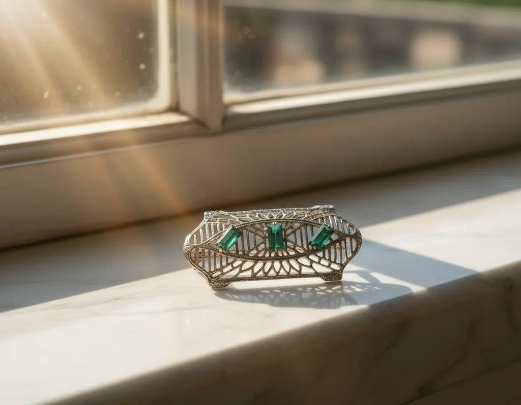 Perfect for vintage jewelry lovers: our Subtle Vintage Art Deco Bar Pin with green stones provides timeless elegance and sophistication. Shop today!