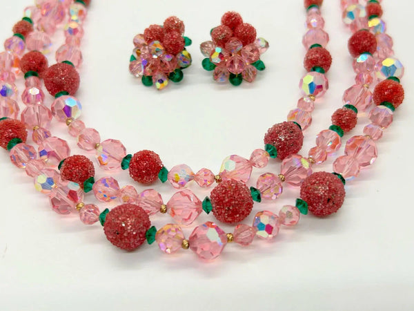 Vintage Glamour in Pink, Red and Green Glittering Necklace and Earrings Set