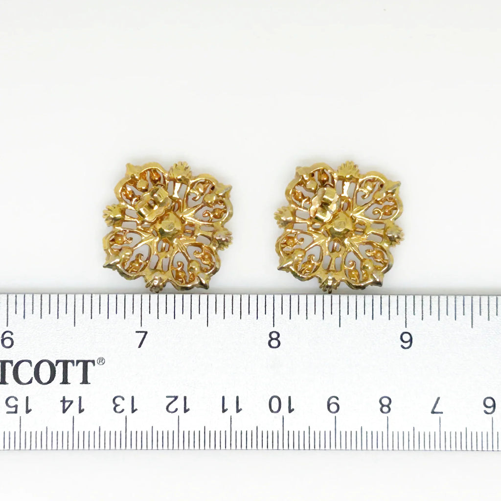 These filigreed vintage red earrings offer an exquisite aesthetic, beautifully detailed with pink, purple, and red chaton rhinestones in a square pattern. Meticulously designed, each earring's dimensions measure 3/4" square. The backs feature a post closure. Indulge in a touch of vintage elegance with these delicately filigreed red earrings. Adorned with pink, purple, and red chaton rhinestones in a unique square pattern, these earrings are a visual delight. The meticulous design and 3/4" square dimensions make them a perfect accessory for any occasion, while the secure post closure ensures comfortable wear. Elevate your style with these exquisite earrings today!