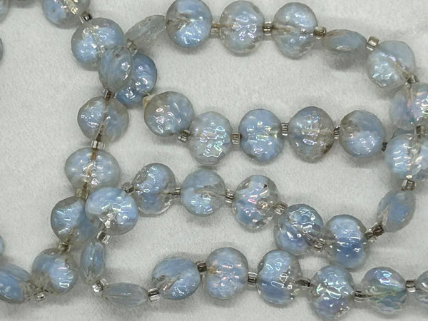 Experience the unique beauty of our Clear and Pale Blue Gray Bead Necklace. Each iridescent, textured pale blue bead is one-of-a-kind, creating a mesmerizing play of light. The delicate clear separators only enhance the elegance of this vintage necklace. With a length of 22 inches and convenient barrel clasp, it's the perfect way to add a touch of sophistication to any outfit.