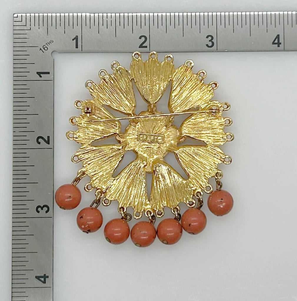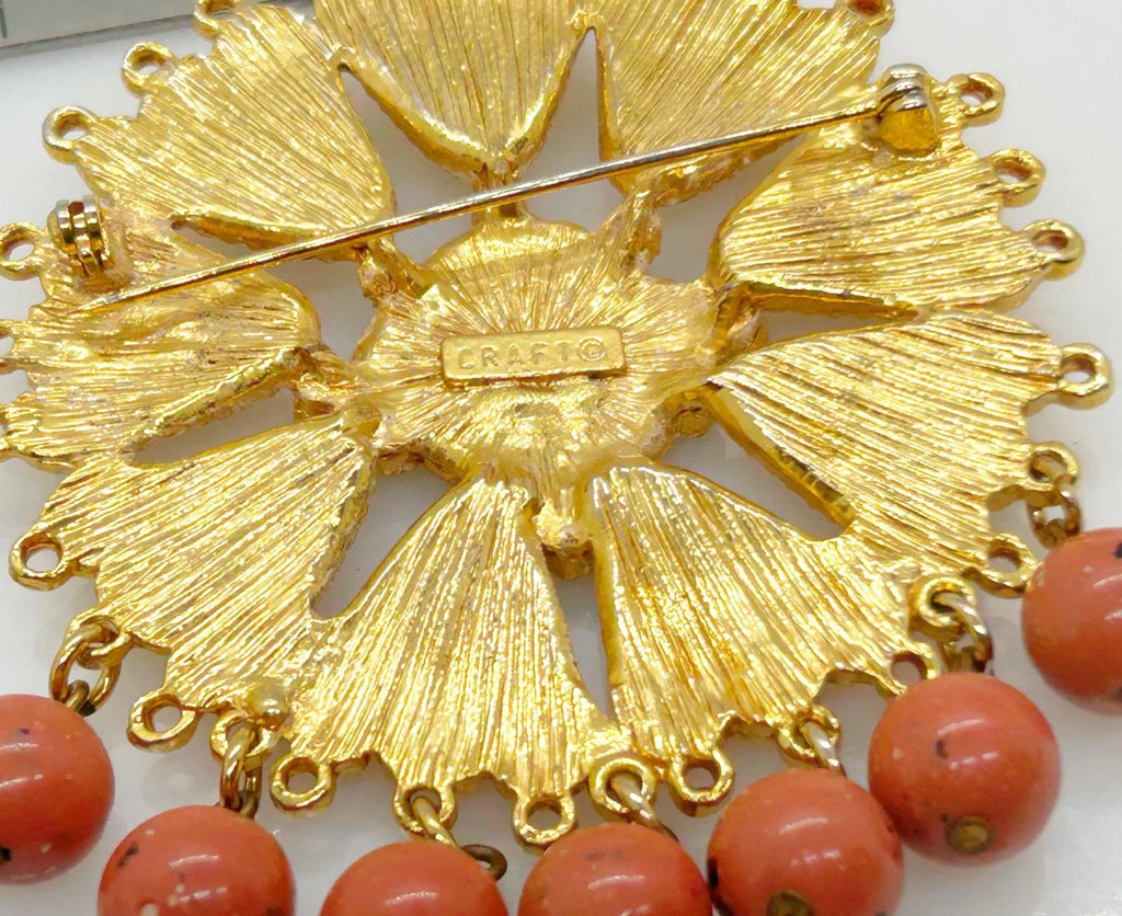 This is a beautiful piece of workmanship. Nine triangular sections of gold metal surround an ornate circular medallion. The brooch is set with black enameled circles and has even faux carnelian round drops. It measures 2 1/2" without the drops, and 3" at the longest point with the dangles. It is signed Craft in uppercase letters and is in very good condition.