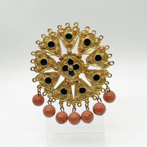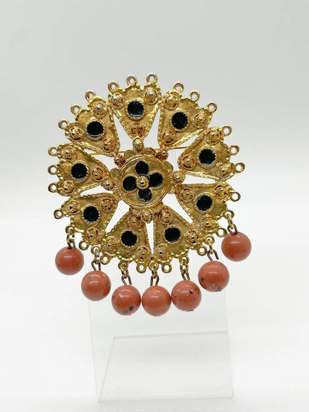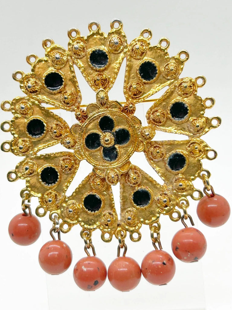Transform your outfit into a masterpiece with our Renaissance Style Vintage Brooch by Craft. Crafted with care, this breathtaking piece boasts nine intricate gold triangular sections surrounding a luxurious circular medallion. Each black enameled circle adds a touch of sophistication, while the faux carnelian round drops give it a royal finish. Measuring at 2 1/2" without the drops and 3" at its longest point with the dangles, you can't help but feel regal while wearing it. Treat yourself to this stunning brooch, uniquely signed in uppercase letters by Craft, and elevate your wardrobe to new heights of elegance.