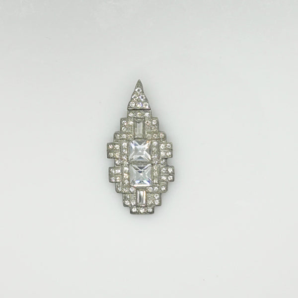 You'll draw attention and compliments with this striking art deco pendant. Its elongated diamond rectangle shape is adorned with dazzling crystals and two sparkling square stones at the center. The unique bail, triangular shaped and studded with stones, adds to the pendant's allure as it gently sways with your every move. This pendant measures just under 2" in length, making it the perfect statement piece for any occasion.