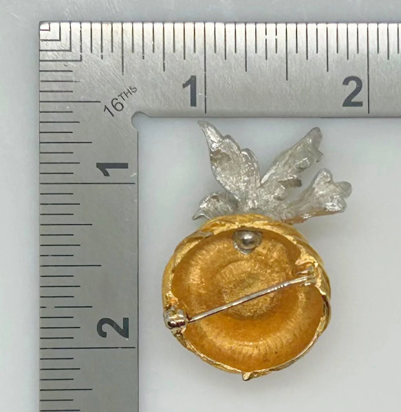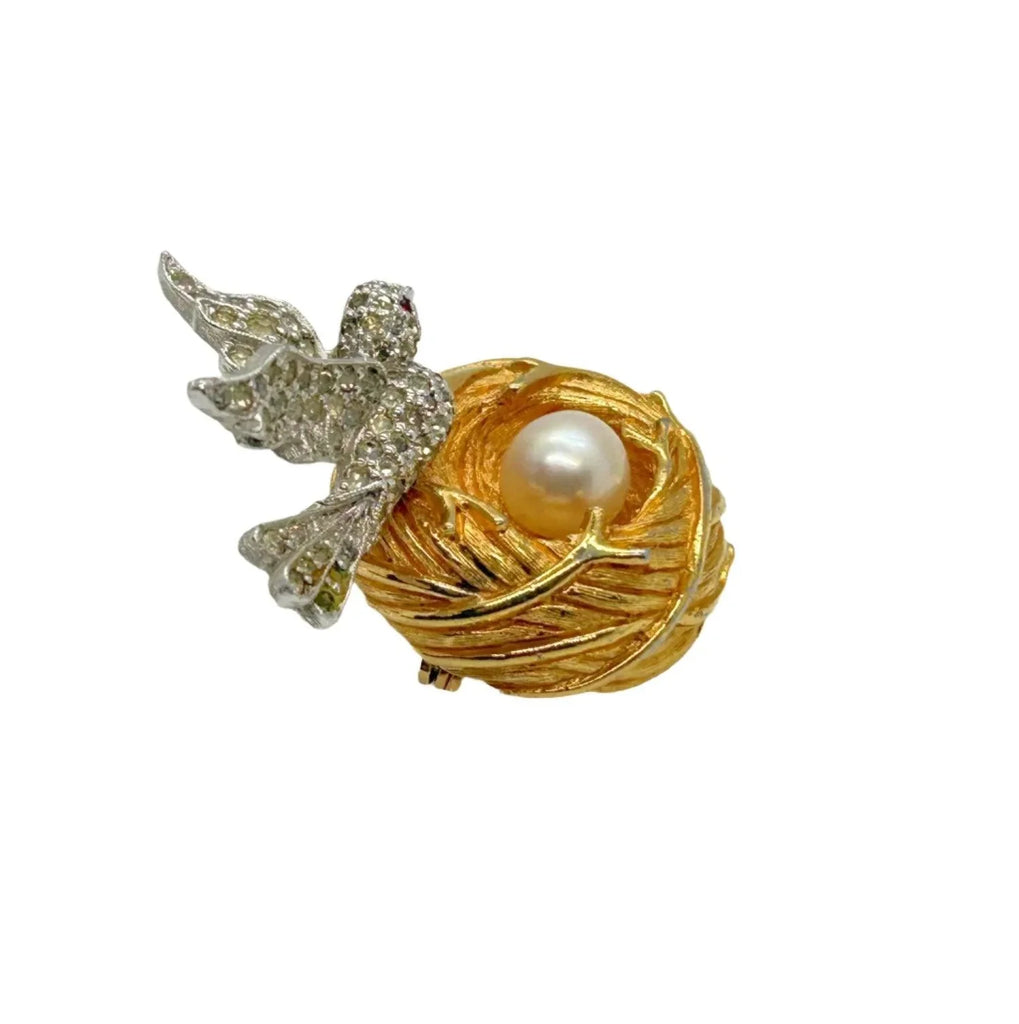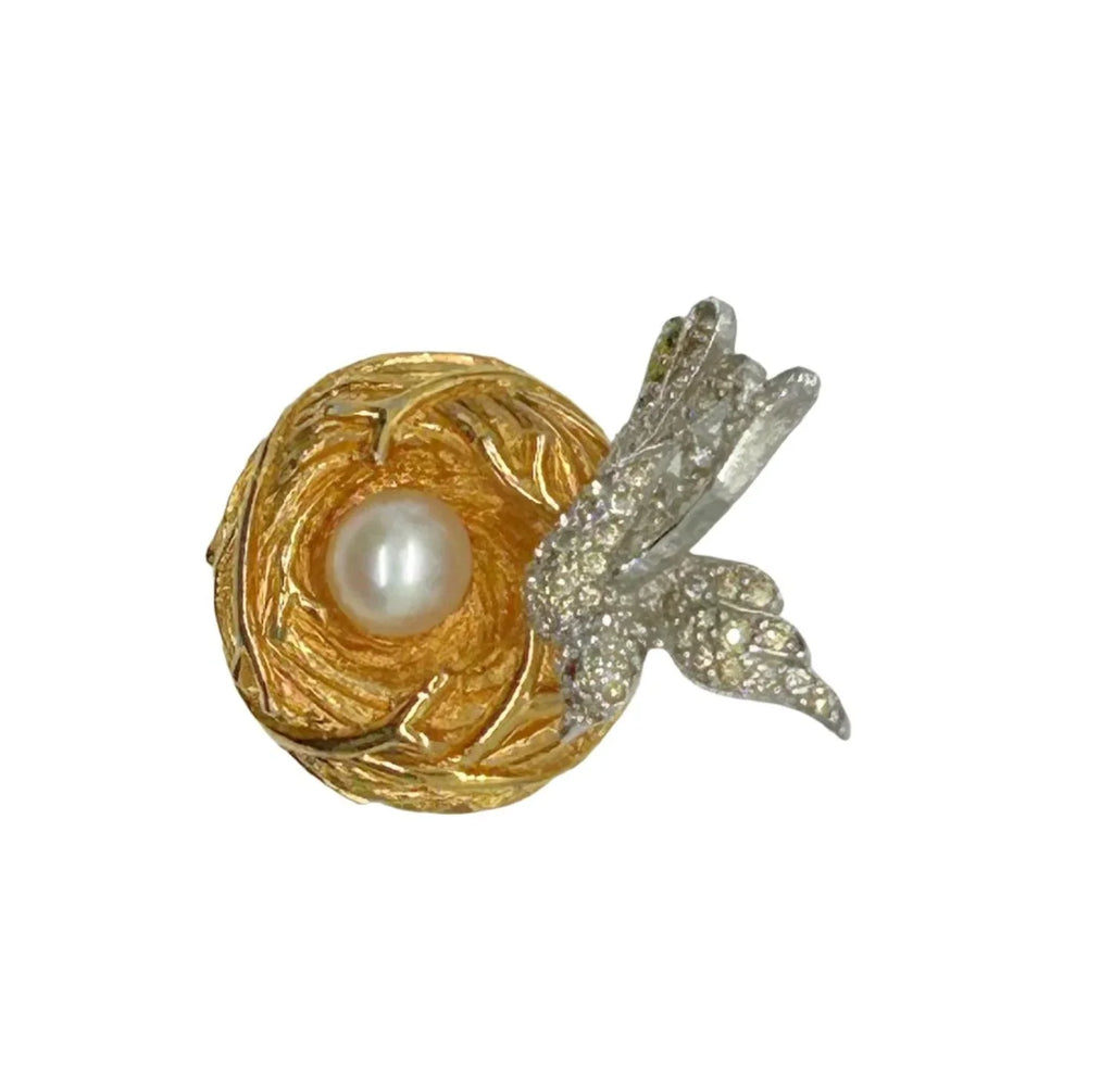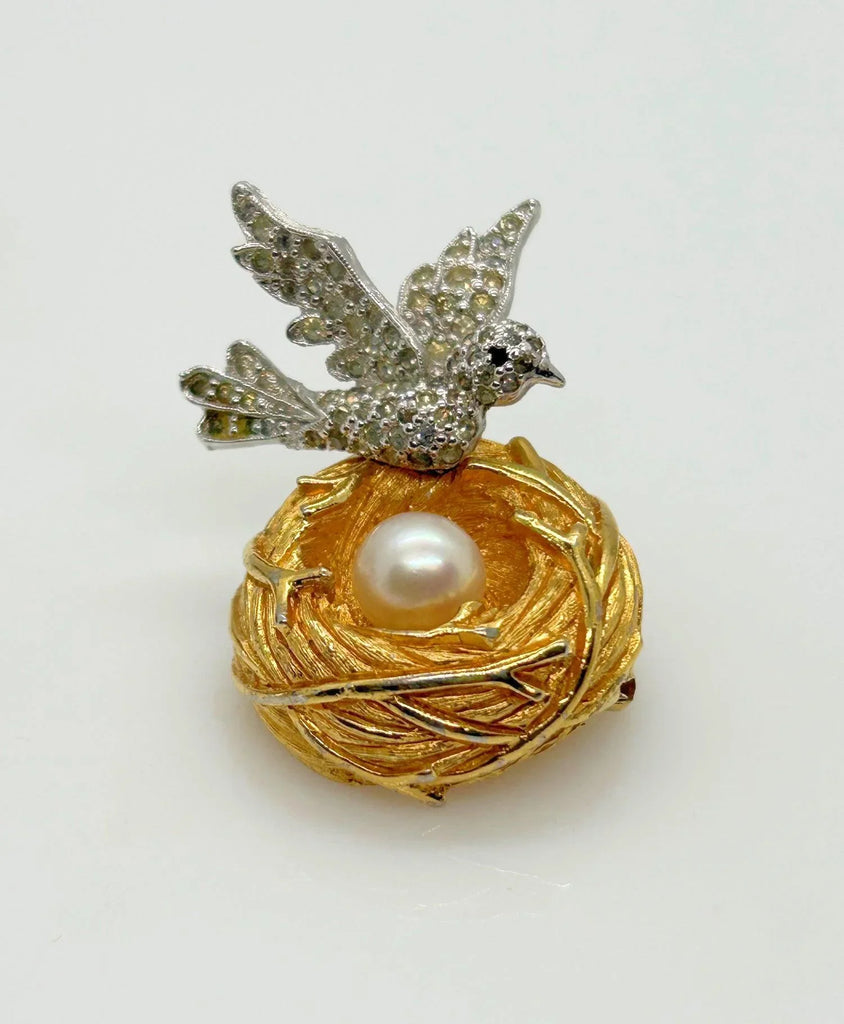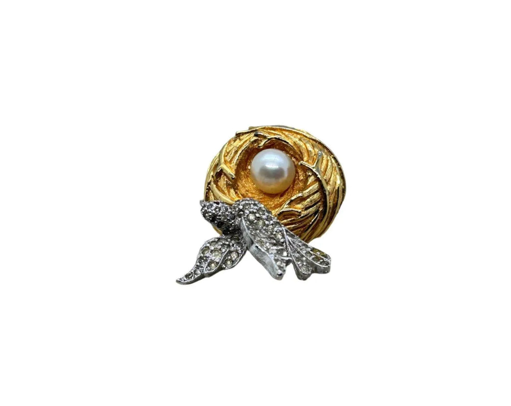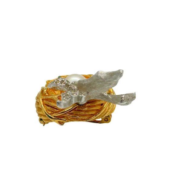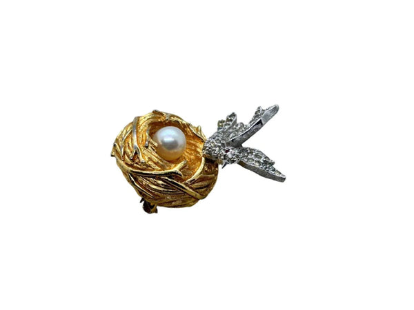Two-tone Vintage Bird and Nest with Pearl Egg Brooch