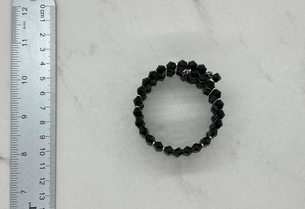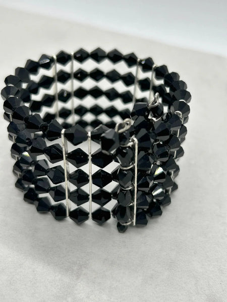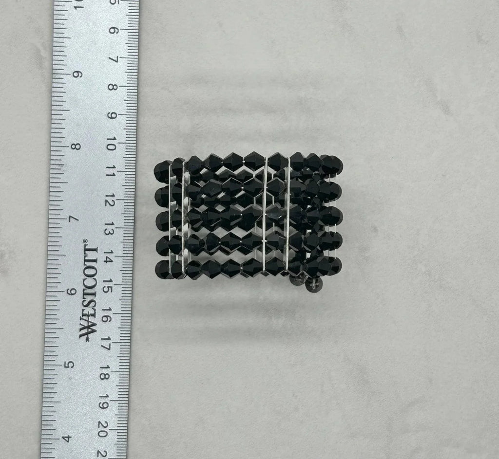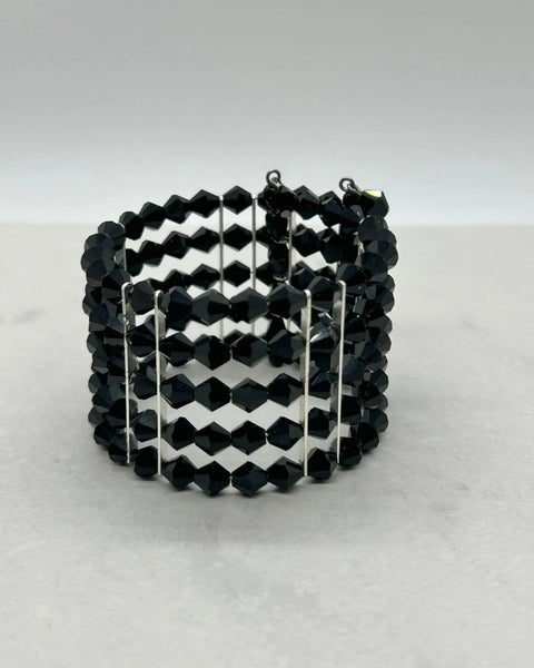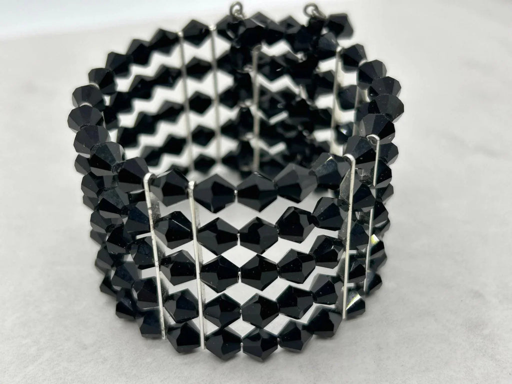 Crafted with five exquisite rows of jet beads and silver tone stations, this bracelet is designed to keep its impeccable shape. Versatile and unique, it's the perfect addition to any outfit. Measuring 1.5 inches tall and in excellent condition, it's a piece that will effortlessly elevate your style and make you stand out in a sophisticated crowd.