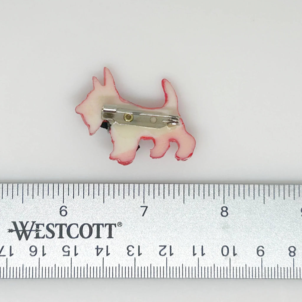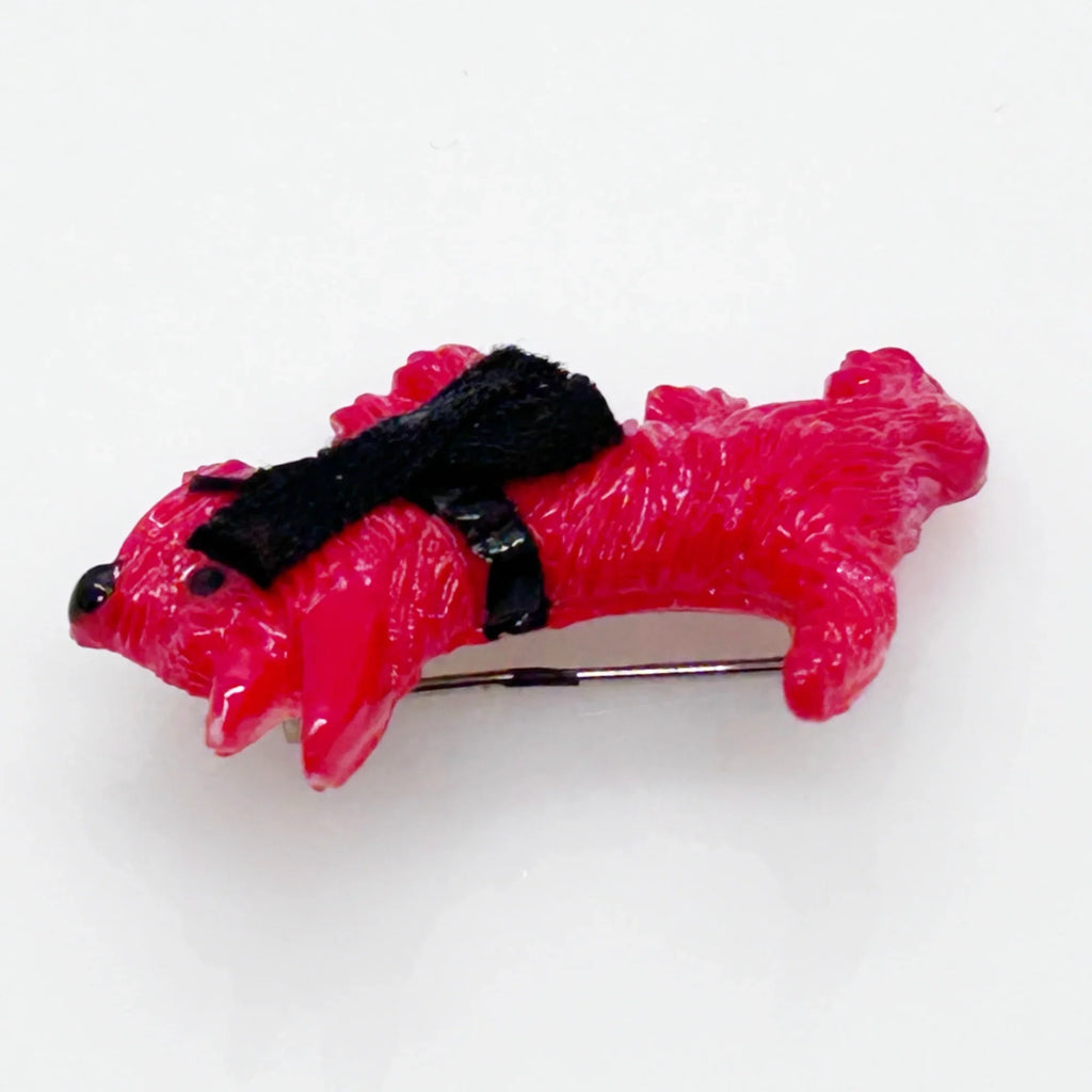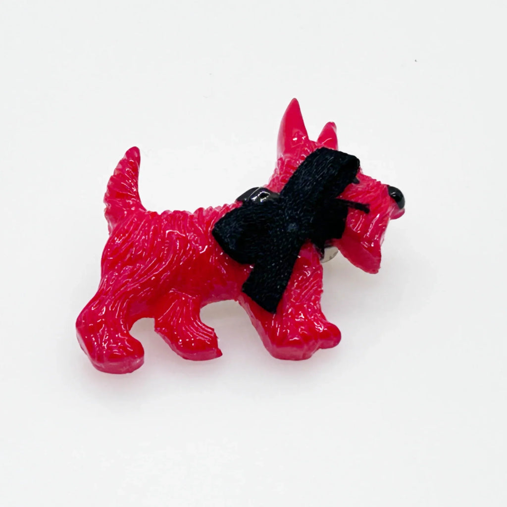 Adopt this captivating and unusual Scottie Dog Brooch, crafted in a bold red hue with a lavish black ribbon bow adorning its neck. Measuring 1.25" in width, it is in impeccable condition. His black collar and nose complete the look. White spots in photos ar light reflecting off the glossy finish of the pin.Elevate your style with this striking and distinctive Scottie Dog Brooch. Crafted in a vibrant red color with a luxurious black ribbon bow accent, this piece exudes sophistication. Measuring 1.25" wide and in pristine condition, it's an exquisite addition to any outfit.