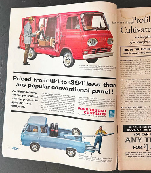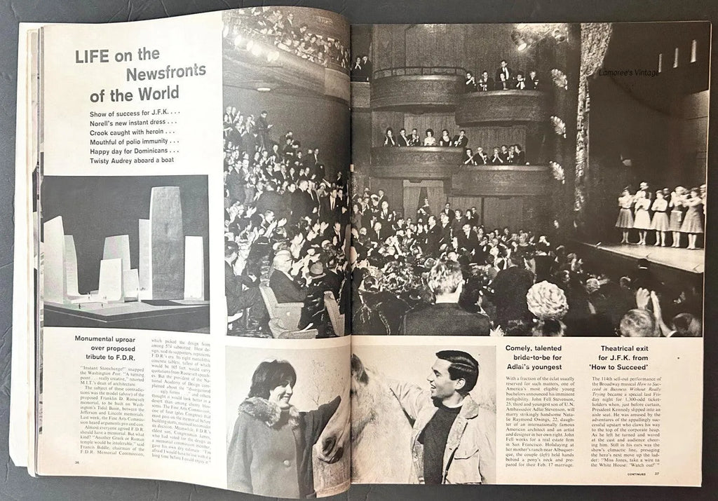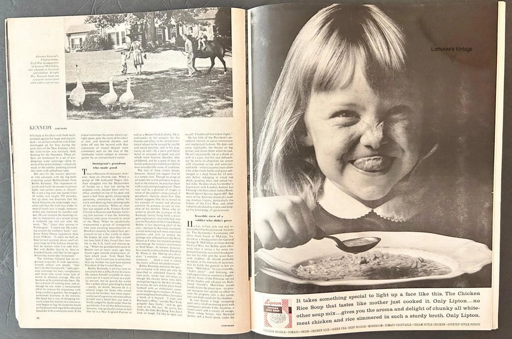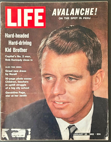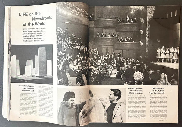 Cover story: Bobby Kennedy, fashion by Norell, a 16 page photo essay on challenges of a big city school, and actress Geraldine Page. The issue also covers disasters such as earthquakes and mudslides, across the world. More articles describe discussion of a monument to FDR, the polio vaccine, Audrey Hepburn, a noteworthy pearl. There are many great ads, including Green Giant, RC Cola. It has 103 pages, small mailing label on front.