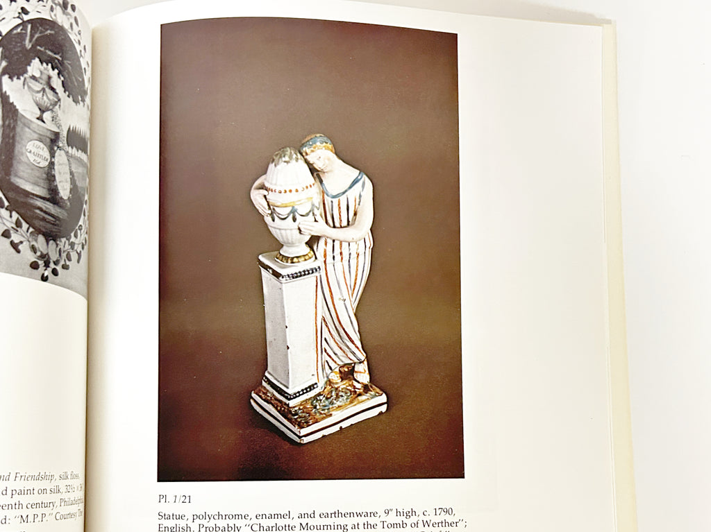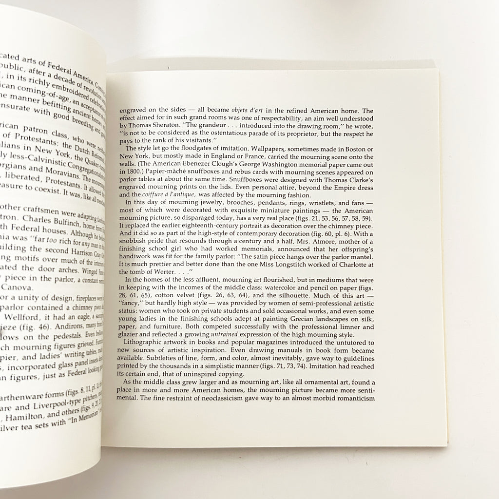 Mourning Becomes America: Mourning Art in the New Nation, researched and prepared by Anita Schorsch. The book accompanied an exhibition held at the William Penn Memorial Museum and the Albany Institute of History and Art. IIt features examples of mourning art, such as scarves, purses, jewelry, and prints, that flourished in the Eastern United States during the first half of the nineteenth century. The original exhibition displayed over 250 items. The book was first published in 1976.