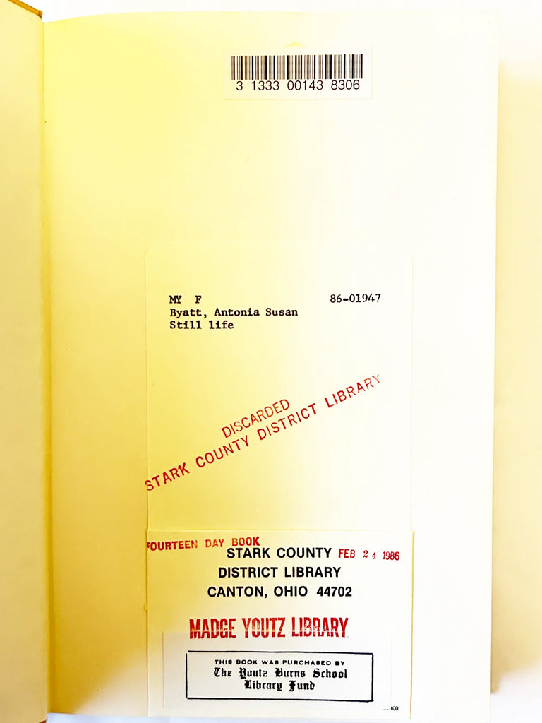 This is a first edition/first printing hardcover copy of the novel Still Life by Antonia Byatt (A.S. Byatt). The novel is the second volume of the "Frederica Potter" tetralogy and follows the Potter siblings in 1950s England as they navigate choices between domesticity, ambition, life, and art. Hardcover, dust jacket. Ex-lib with appropriate markings- please see photos. The dust jacket is attached, remnants of glue are still visible.The edging is perfect, a gold- copper color.