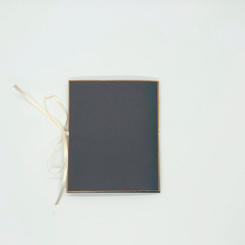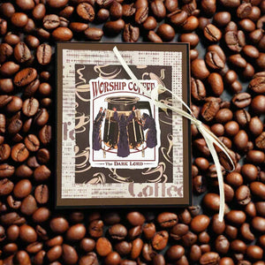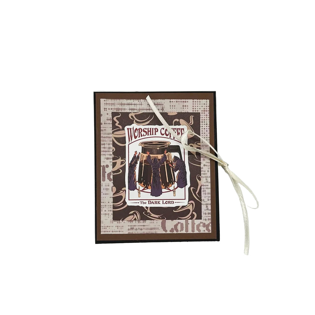 This is a dark roast take on our obsession with coffee. The cover jokes: "worship coffee -the dark lord" and shows robed figures around a carafe of coffee. Inside are humorous comments and places to write down thoughts or reminders to restock your coffee.This one of a kind, hand crafted mini journal measures in 4" tall, 3" wide. It is made of acid free paper, chip board and has a white silk ribbon closure.