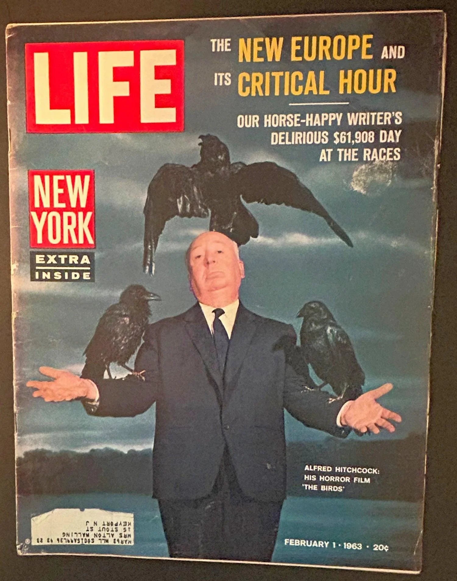 Cover photo and story: Alfred Hitchcock and "The Birds"; The New Europe and Its Critical Hour; story about Bil & Cora Baird and their "geometrical, space age" puppet show "Man on the Moon"; Spanish influenced furniture for the American home; ladies of Europe, from Assembly line girls to aristocrats including Baroness Heinrich Thyssen-Bornemisza, her art and her daughter; thrilling horse race betting story; profile of actor Anthony Quinn; possum looking for a safe place in a city; among other. 71 pages, mailing label on the front cover.