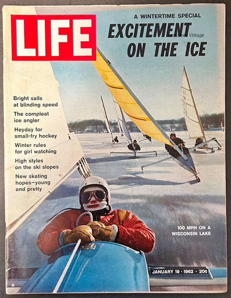 Wintertime special: ice boating races in Wisconsin, ice fishing, kids' hockey, "girl watching" on the ski slopes, promising young figure skaters training to replace teammates who died in crash, the newest in ski clothes; problems in Algeria, South Dakota cattle driver Don Hight drives 1800 cattle 70 miles instead of having them moved by truck; Konrad Adenauer turns 86, open letter to the British warning them against switching to the decimal system, dancer Juliet Prowse, and more. This issue has 100 pages, no mailing label.