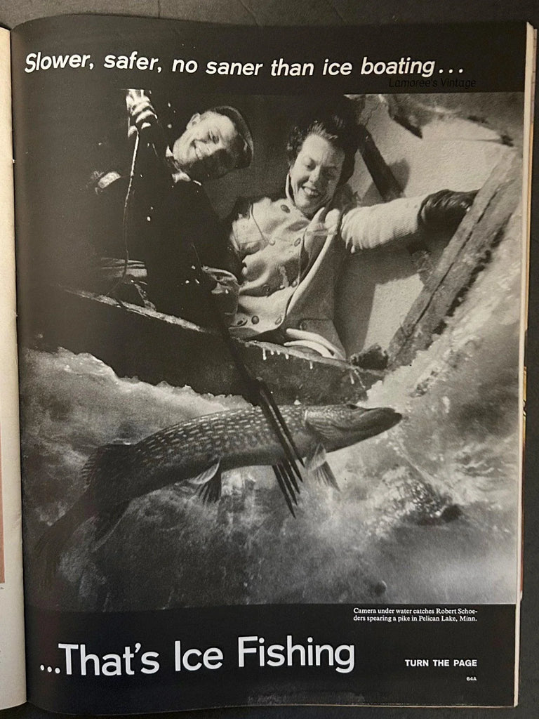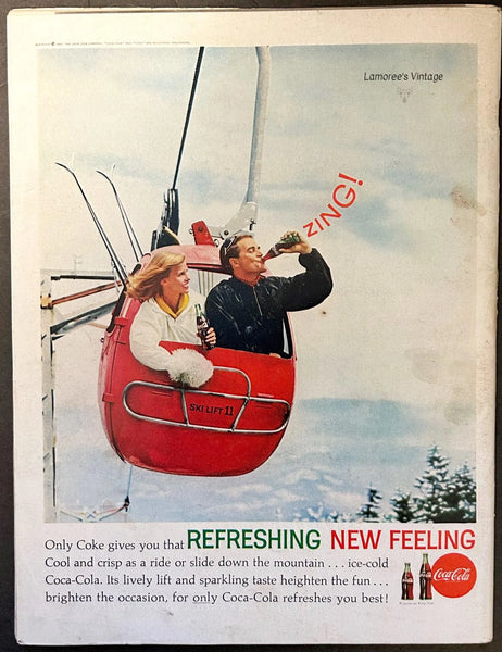 Ads: Full page color Log Cabin syrup ad features "bacon logs" breakfast, (French toast and bacon strips stacked like a cabin), Philco portable televisions, Columbia record club, Pillsbury Cake Mixes, Coke ad with couple on ski gondola, Friskies dog food, Chevrolet cars, Cadillac Coupe de Ville; Sanka coffee, '62 Chevrolet with Advanced Thrust, Ford Galaxie, Olds F-85, Pontiac Tempest Coupe, GE Flashbulbs, Nabisco Premium saltines, The Detroit Red Wings hockey team and coach Sid Abel promote drinking tea, Hoover, numerous ski related ads.