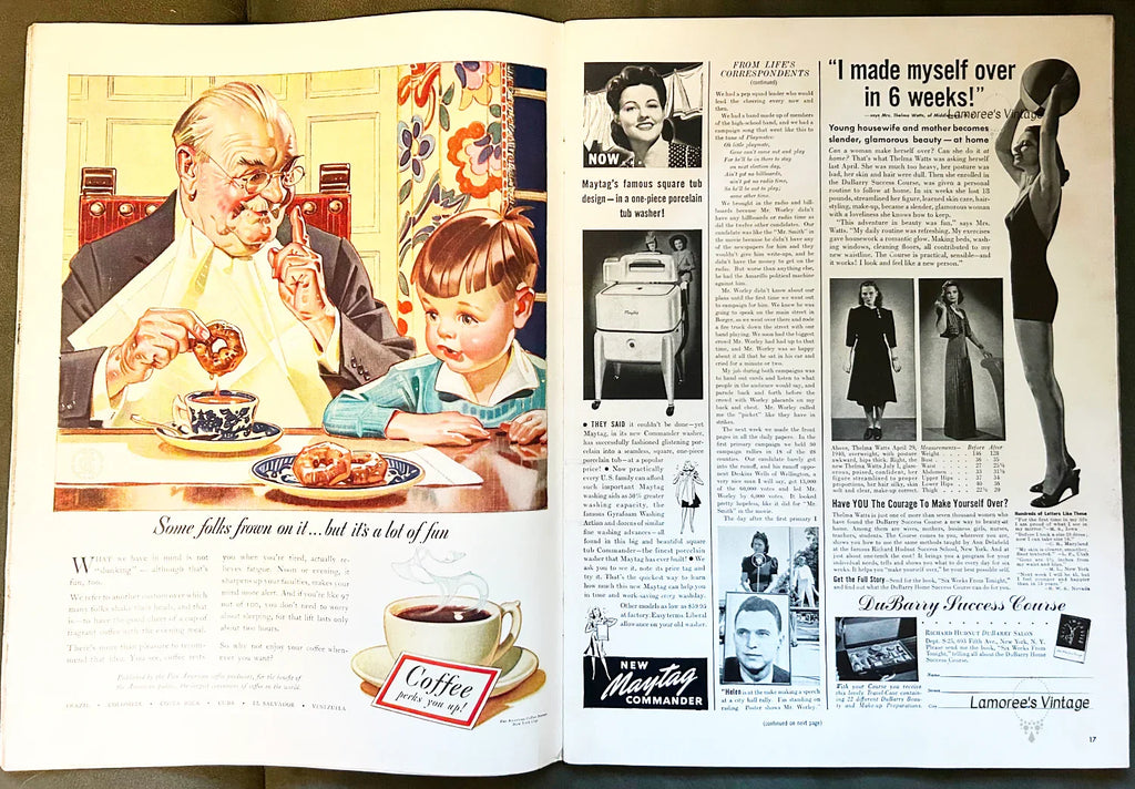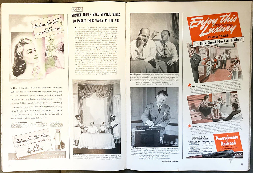 Many excellent ads including back cover with space pioneer "Tommy" Tomlinson; 124 pages; Small mailing label on back cover, some damage on right side of front cover, see photo. Ads include: Boxco milk amplifier ad, Pan American coffee producers ad with art by J. C. Leyendecker; DeSoto car ad with red convertible, Pennsylvania Railroad, Pall Mall cigarettes ad with art by John Falter and Camel cigarette and with "Tommy" Tomlinson.