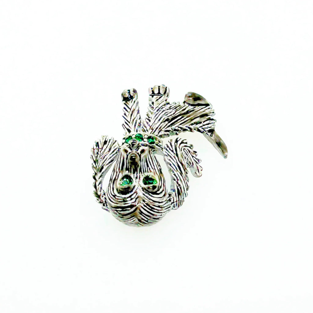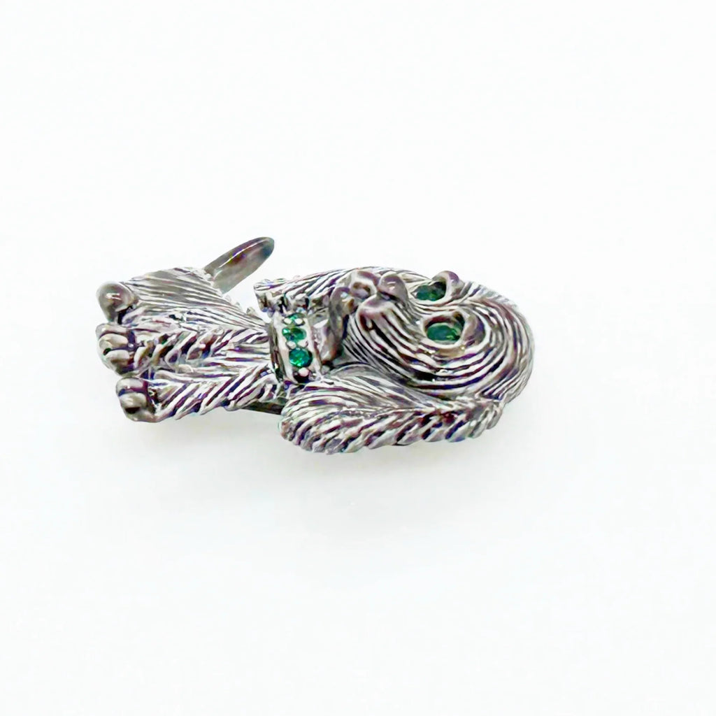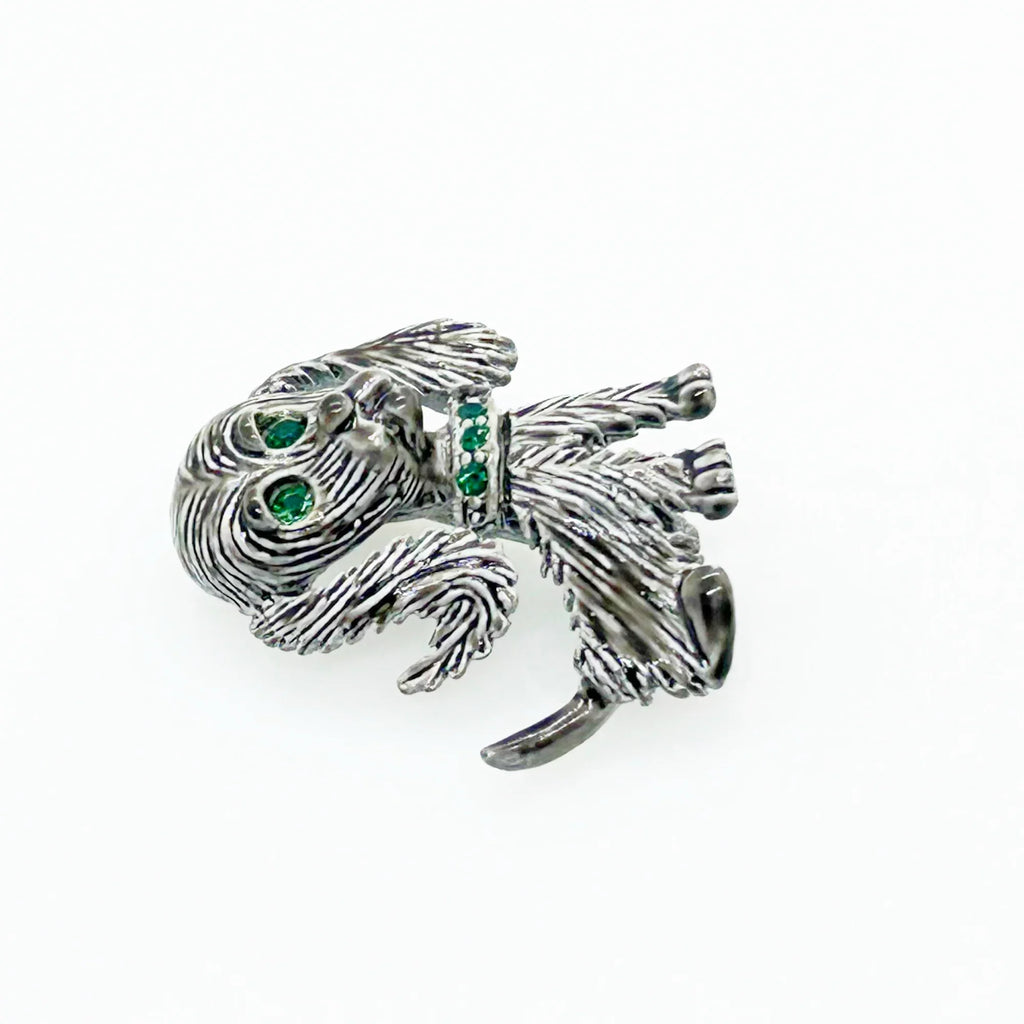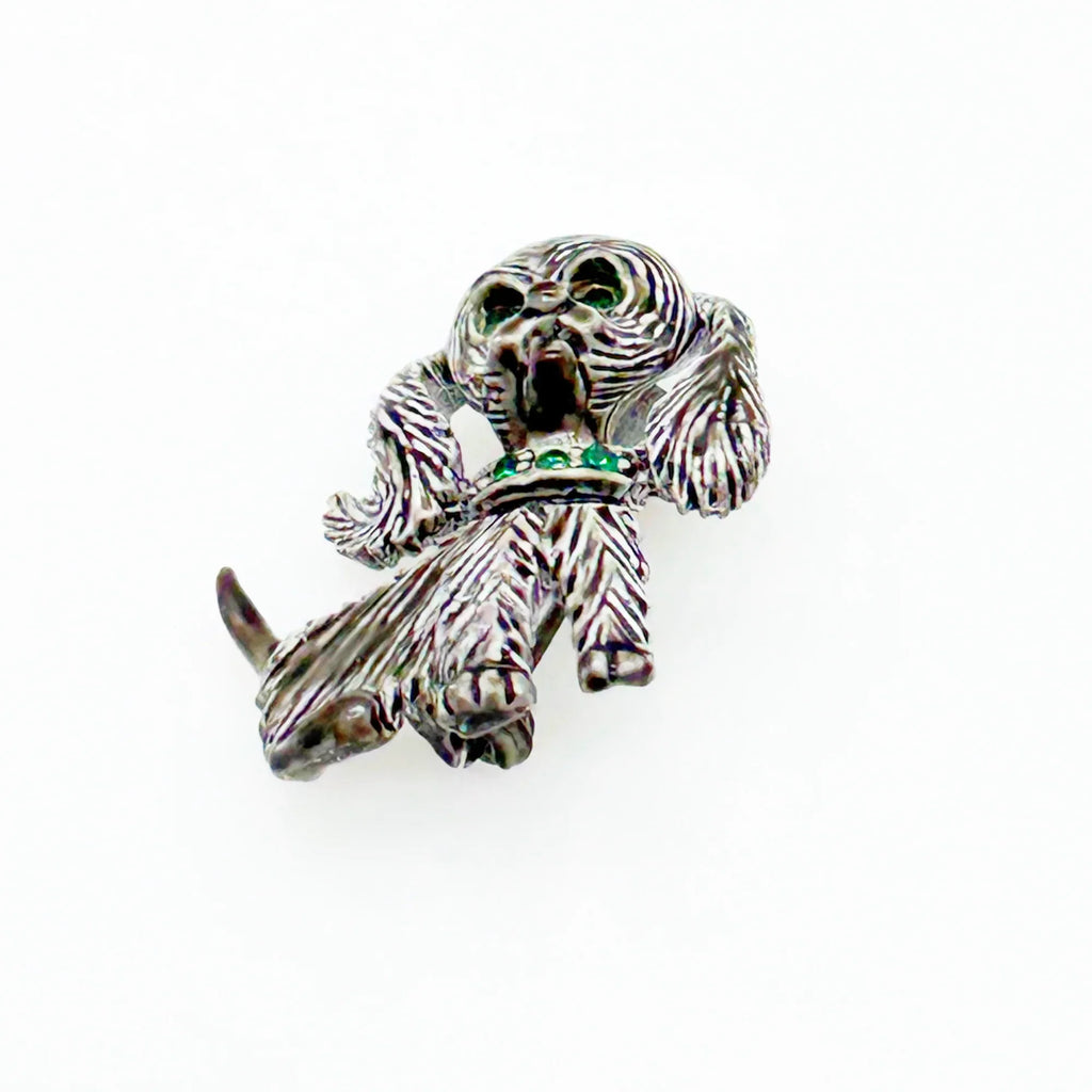 This vintage Gerry's brooch shows an adorable, floppy eared puppy dog. He has bright green eyes and collar and wagging tail. He's just waiting for you! His coat is well detailed in silver tone metal. He or she measures 1 3/4" tall and is marked "Gerry's" in capitals on the white enamel back.