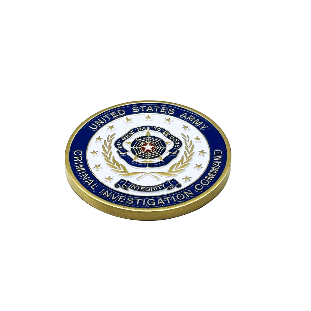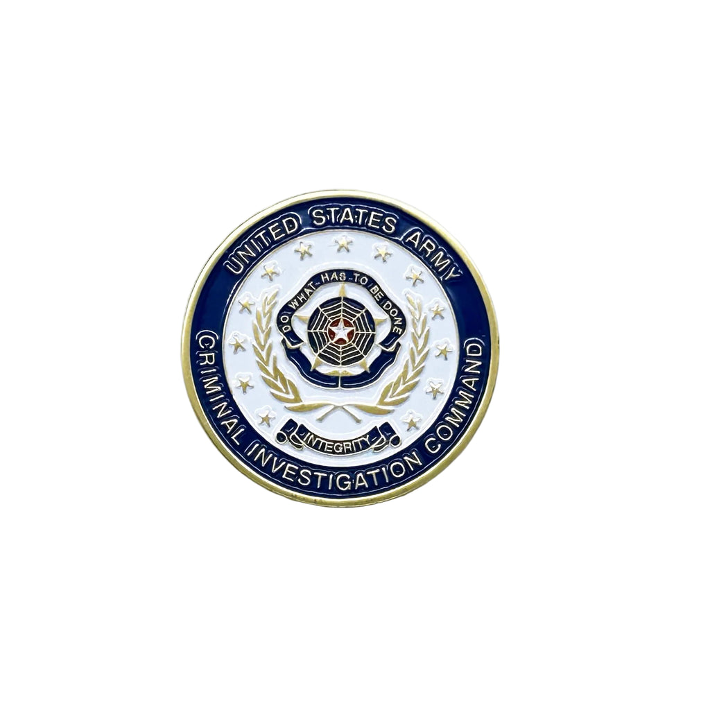 This distinctive challenge coin commemorates the United States Army Criminal Investigation Command with striking enamel detailing in white, blue, black, and gold. The obverse features "Integrity" and "Do What Has to be Done," core values that define the CID mission. The reverse showcases the Great Seal surrounded by "Protecting the Protectors" and "Doing What Has to be Done," with the Latin inscriptions "Annuit Cleptis" (fortune favors our mission) and "Novus Ordo Seclorum" (a new order of the ages)—both from Virgil. A meaningful piece for military collectors, veterans, or anyone who appreciates authentic Army heritage and symbolism.