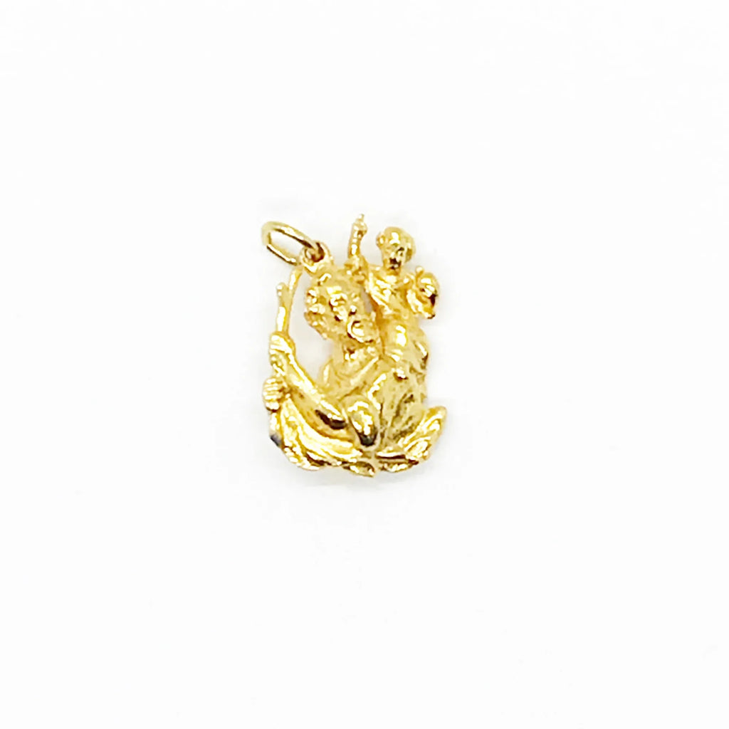 Experience the timeless message of faith and strength with our Vintage Abraham Pendant/ Charm. Crafted with intricate detail and a stunning gold tone, this piece truly captures the enduring bond between Abraham and Isaac. The focal point of the pendant is Abraham, gazing upwards with an angel watching over him. Measuring slightly over 1" tall, this pendant is a powerful reminder of the unwavering devotion and guidance that the timeless story of Abraham teaches us. Lift your spirit with this meaningful and impeccably crafted piece.