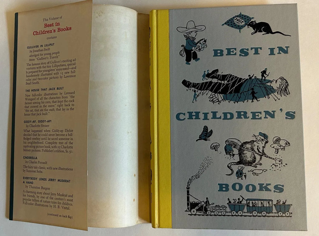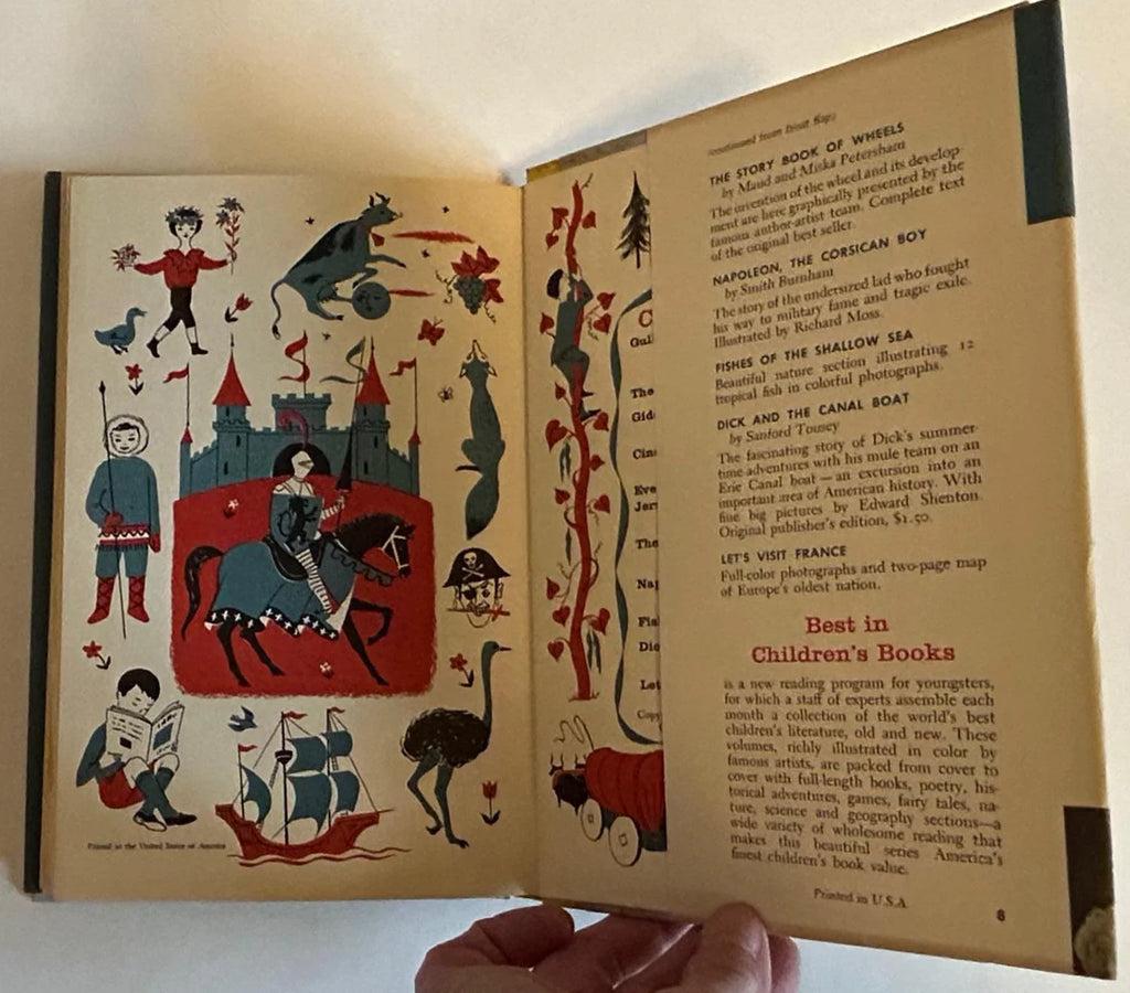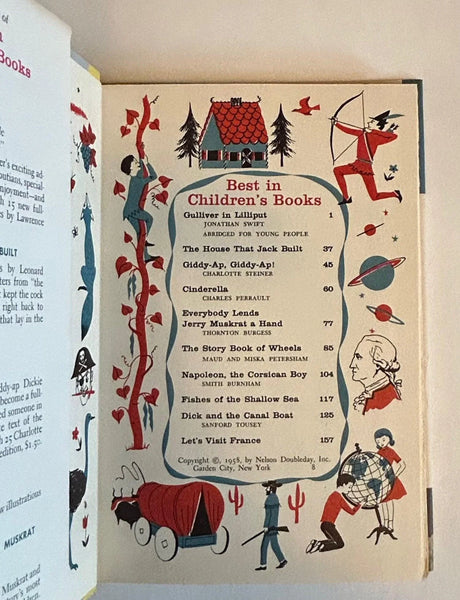 This volume of Best in Children's Books has stories about Gulliver in the Land of Lilliput, by Jonathan Swift ("abridged for young people”), Cinderella, by Charles Perrault, Everybody Lends Jerry Muskrat a Hand, The Story of Wheels, Napoleon, France, and others. There are 160 pages, and include many color illustrations, and includes the dust jacket. The book is in very nice condition. Discover magical adventures and life lessons with beloved classics like Gulliver's Travels and Cinderella, alongside the captivating tales of Jerry Muskrat and the fascinating history of Napoleon and France. With 160 pages filled with vibrant illustrations in every color, this book is a treasure for children of all ages. Experience the thrill of turning each page and immerse yourself in the world of Best in Children's Books.