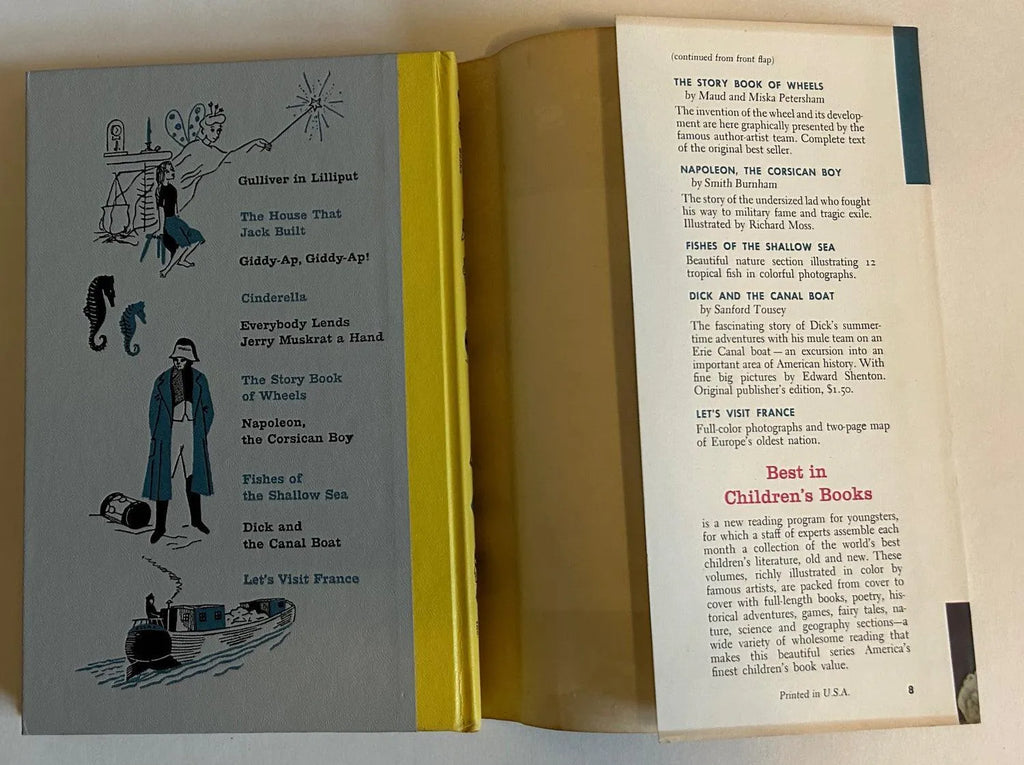 Gulliver in Lilliput by Jonathan Swift, illustrated by Lawrence Beall Smith; the House that Jack Built, illustrated by Leonard Weisgard; Giddy-ap, Giddy-ap! written and illustrated by Charlotte Steiner; Cinderella by Charles Perrault, illustrated by Susanne Suba; Everybody Lends Jerry Muskrat a Hand by Thornton Burgess, illustrated by Herman B. Vestal; the Story Book of Wheels written and illustrated by Maud and Miska Petersham; Napoleon, the Corsican Boy by Smith Burnham, illustrated by Richard Moss; Fishes of the Shallow Sea illustrated with photos; Dick and the Canal Boat by Sanford Tousey, illustrated by Edward Shenton, and Let’s Visit France, illustrated with photos.