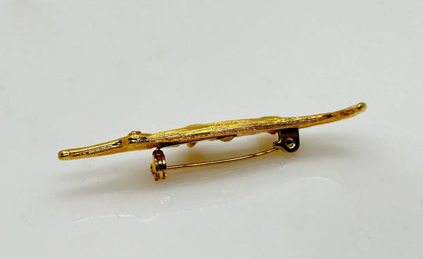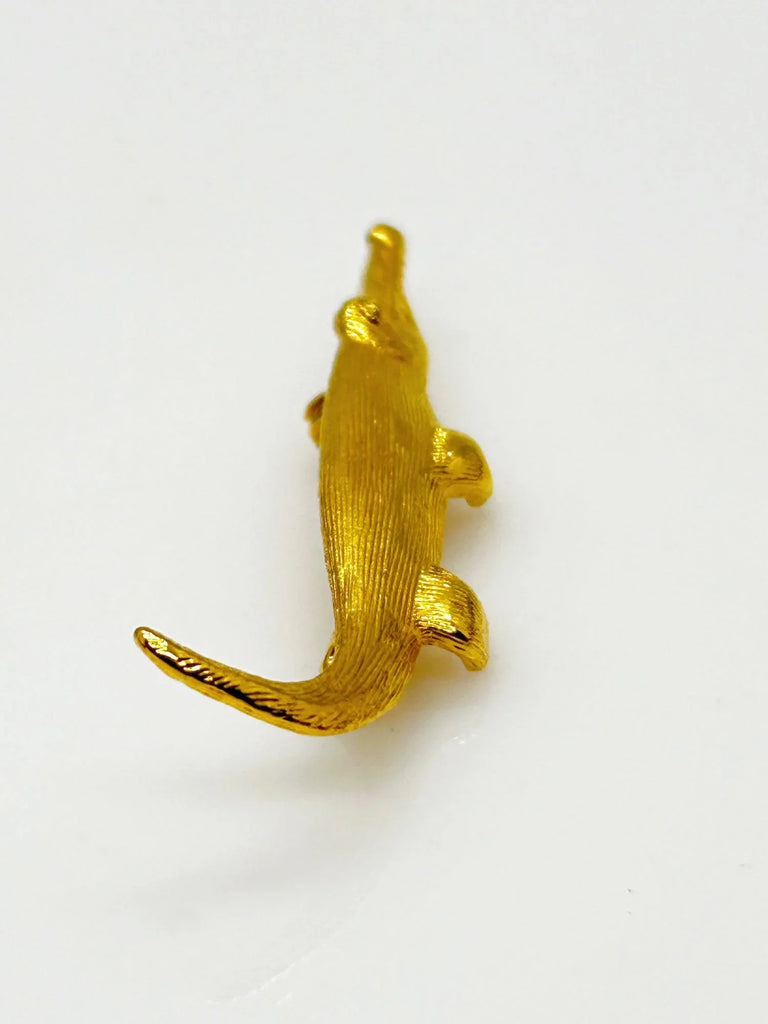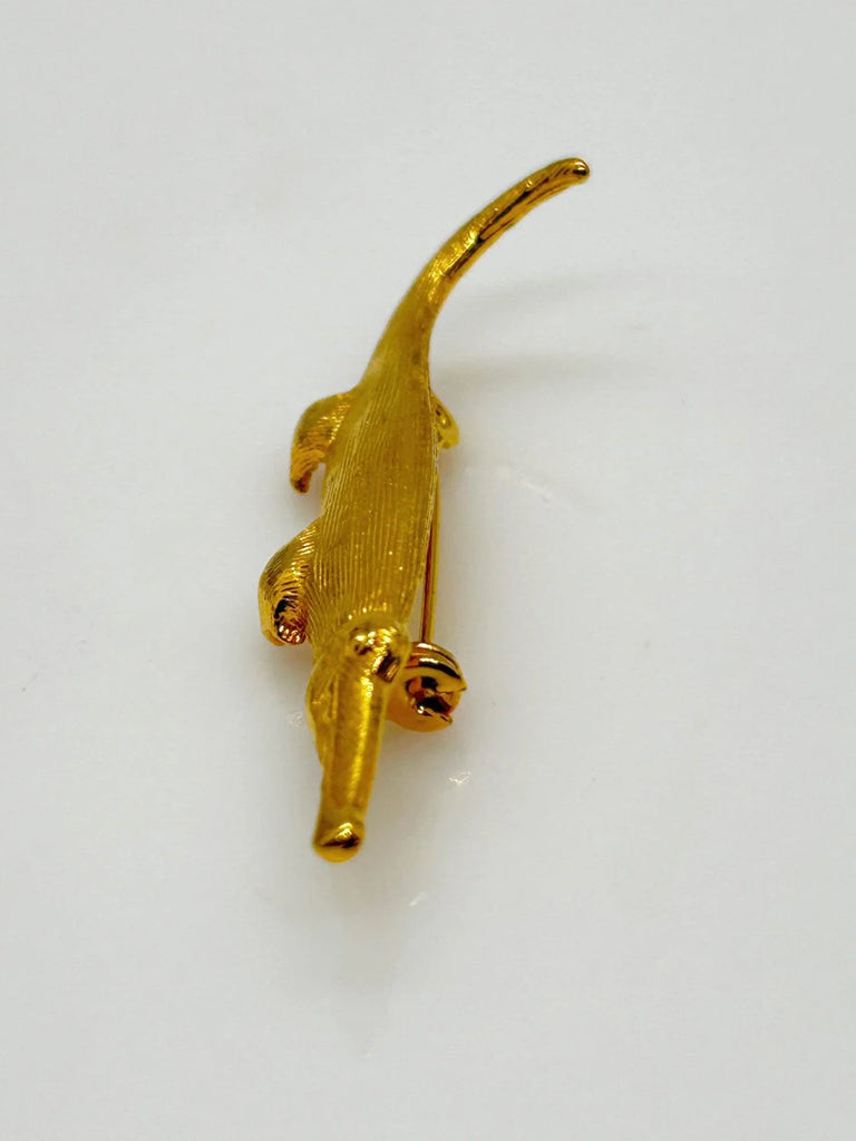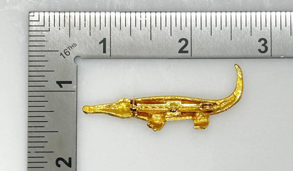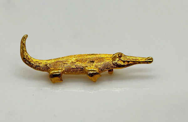 Go wild - with this golden Crocodile-shaped pin! Not only does it feature a unique texturized finish, but it's also in excellent condition, measuring 2 inches in length. Now that's what I call a snappy accessory!This golden crocodile-shaped pin features a textured finish and is in excellent condition, measuring 2 inches in length.