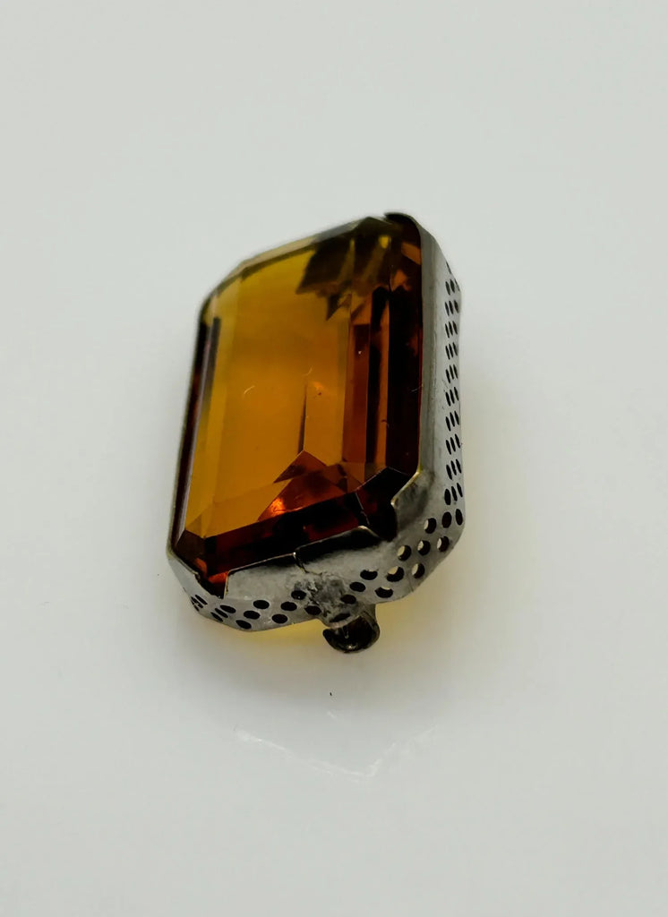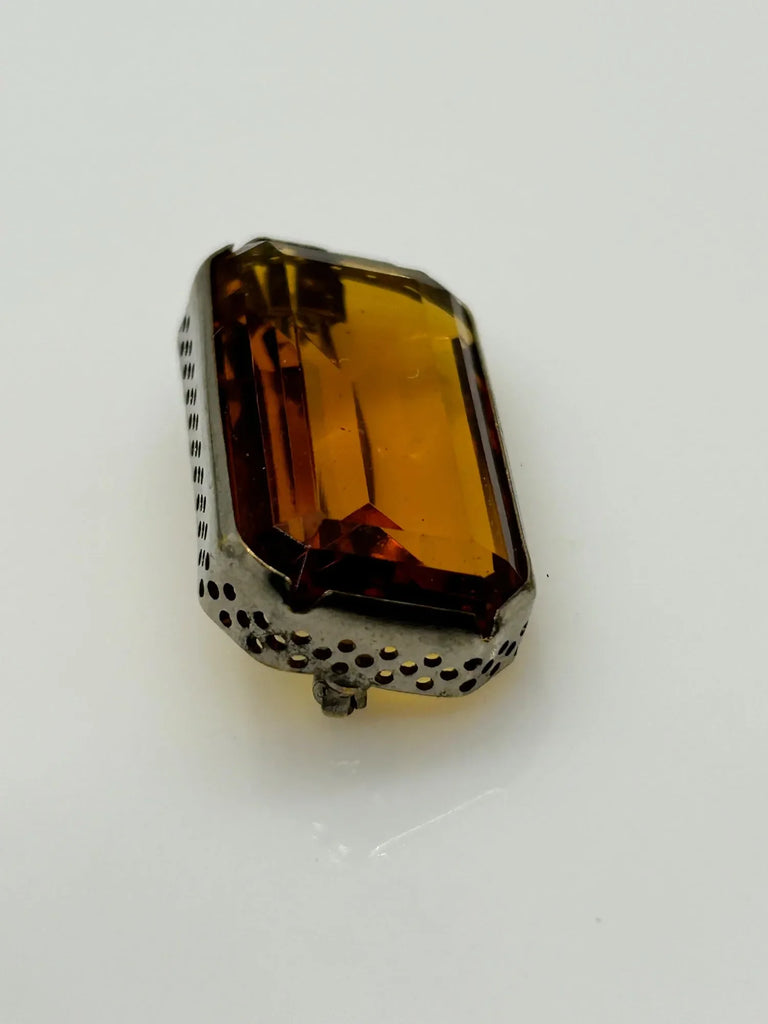 What an elegant Art Deco brooch! This honey-colored brooch is rectangular in shape and sits in a lovely detailed setting with a C clasp. Enhance your ensemble with a touch of Art Deco luxury. This brooch is delicately crafted, and this exquisite, citrine-colored brooch is accentuated with a C clasp to secure it in place. Adorned with intricate details, the rectangular shape measures 1.25" inches and will surely draw the admiration and envy of others. Free Shipping