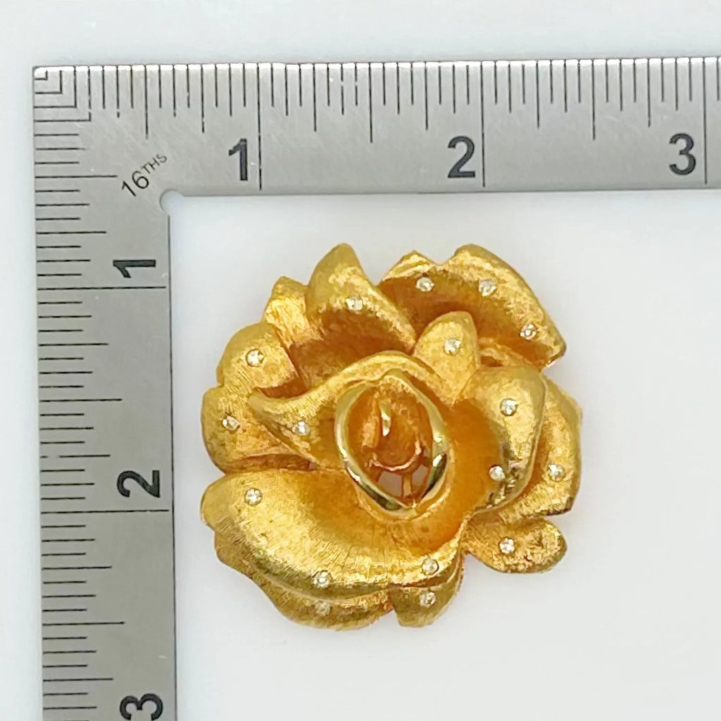 Indulge in the timeless elegance of this exquisite vintage rose brooch. Meticulously crafted with brushed gold metal and adorned with dazzling white rhinestones, this treasure is sure to captivate all who lay eyes on it. Measuring slightly over 1 1/2" wide, it is a symbol of impeccable taste and pristine condition.