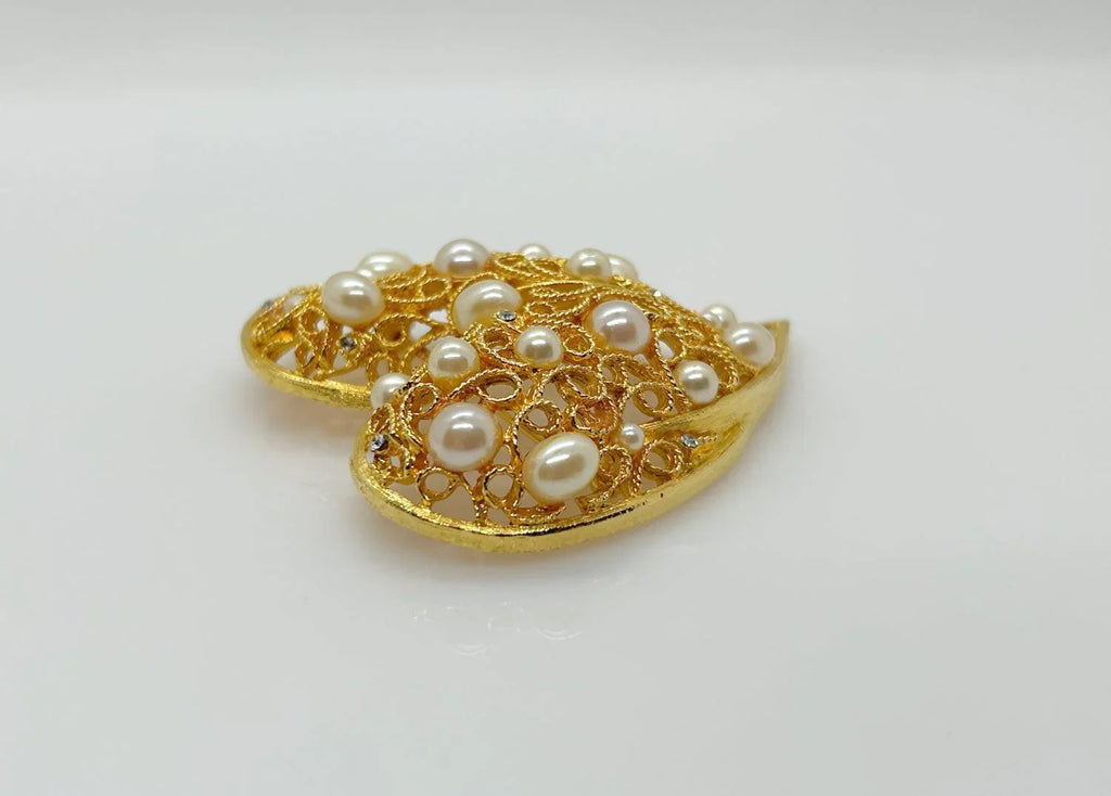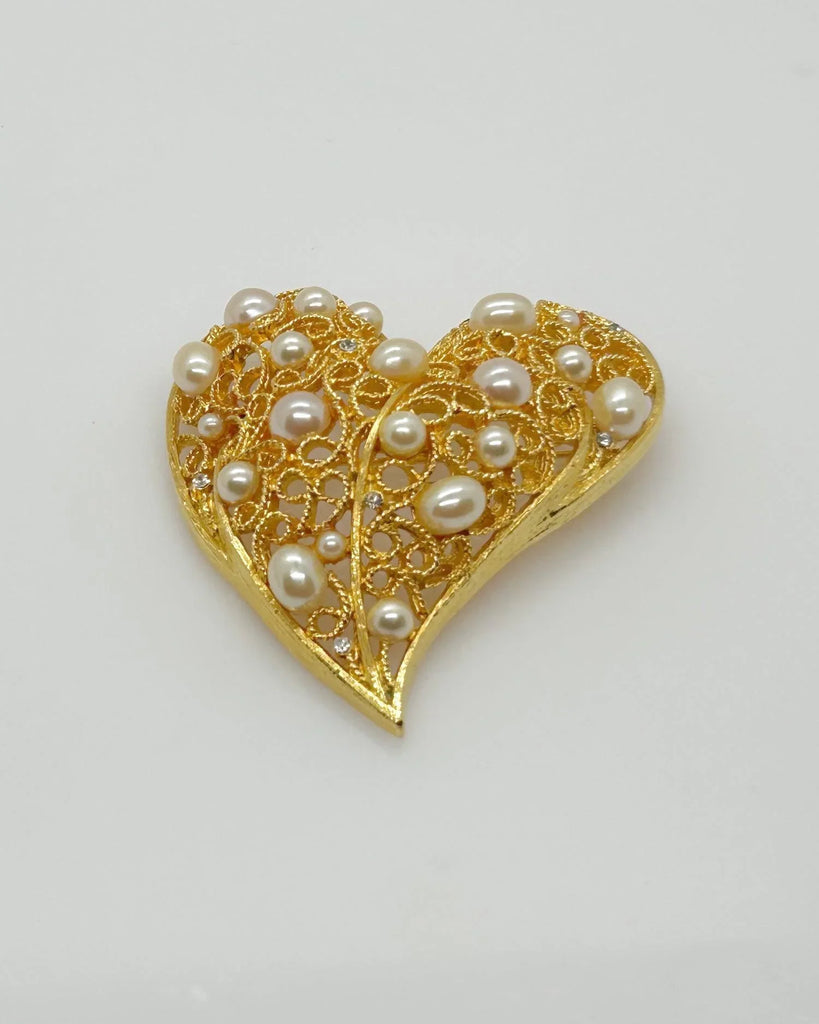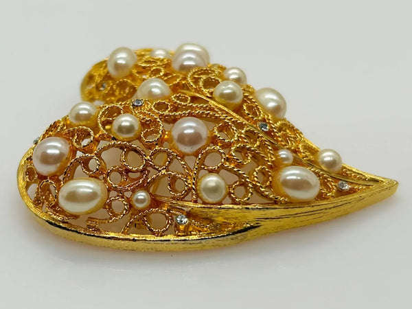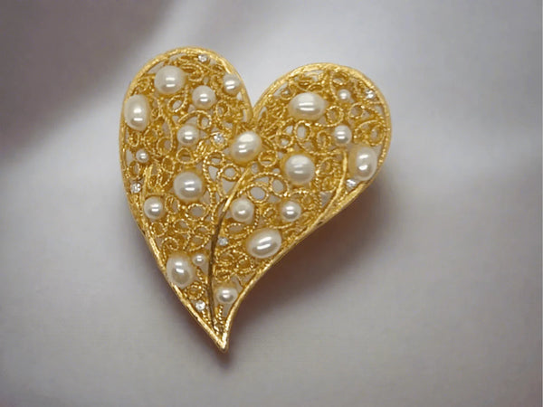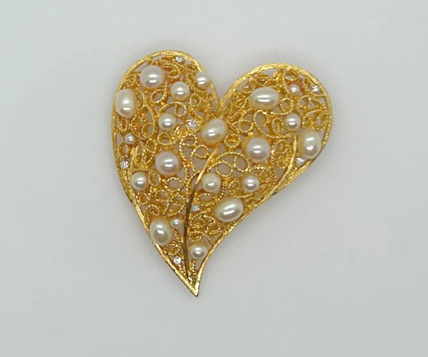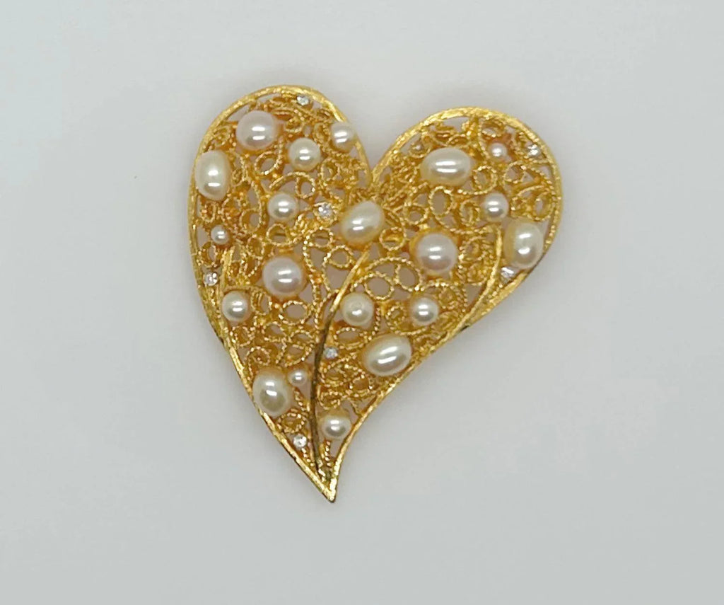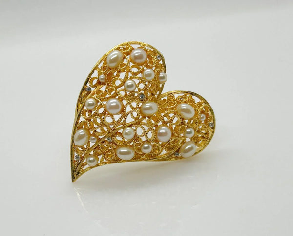 Expertly crafted and in exceptional condition, this vintage heart brooch features a modern design with intricate filigree and faux pearls in various shapes. Tiny rhinestones add subtle sparkle to the piece, which measures 2.5" inches in length and approximately 2" inches in width at its longest and widest points.