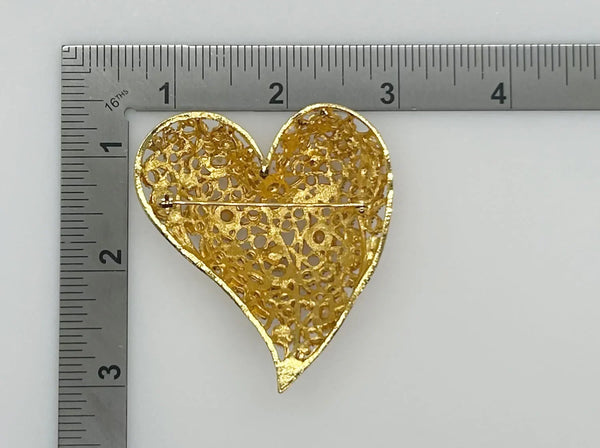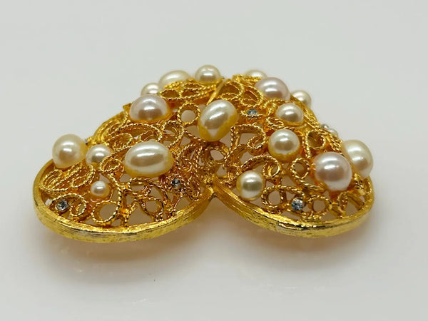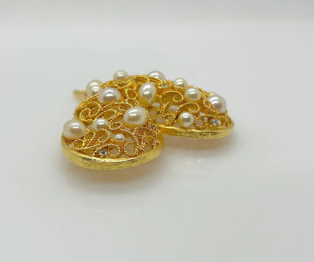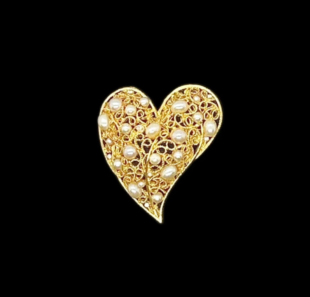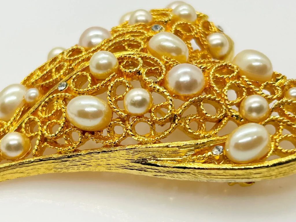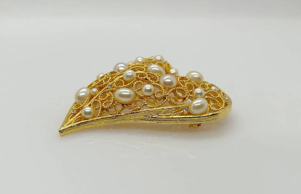 Expertly crafted and in exceptional condition, this vintage heart brooch features a modern design with intricate filigree and faux pearls in various shapes. Tiny rhinestones add subtle sparkle to the piece, which measures 2.5" inches in length and approximately 2" inches in width at its longest and widest points.